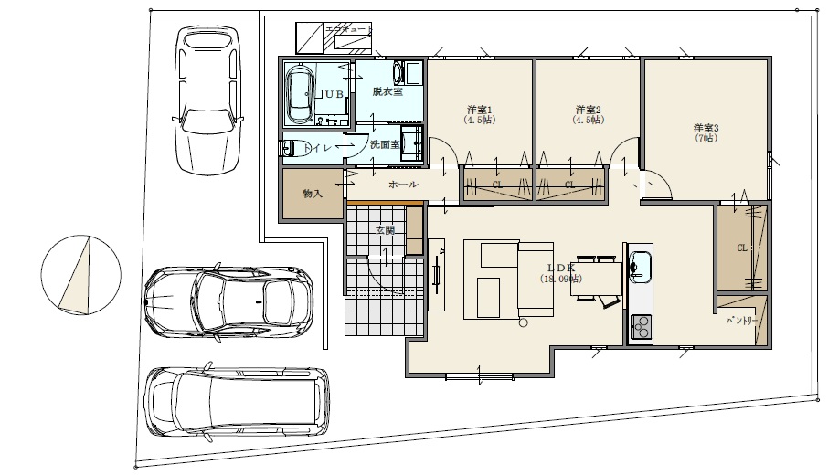 コンパクトにまとまる動線と、駐車場3台の安心感を備えた平屋です。