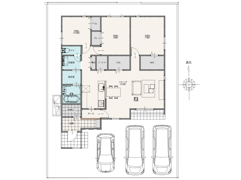 室内は、家族がゆったりと過ごせる21帖の広々LDKを中心に、暮らしやすさを考えた間取りを採用。
