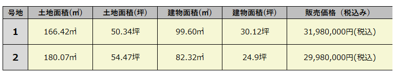 土地面積 / 建物面積 / 販売価格