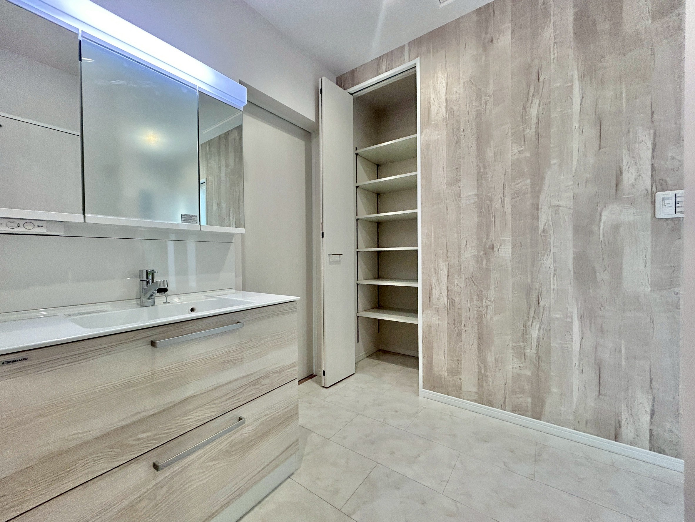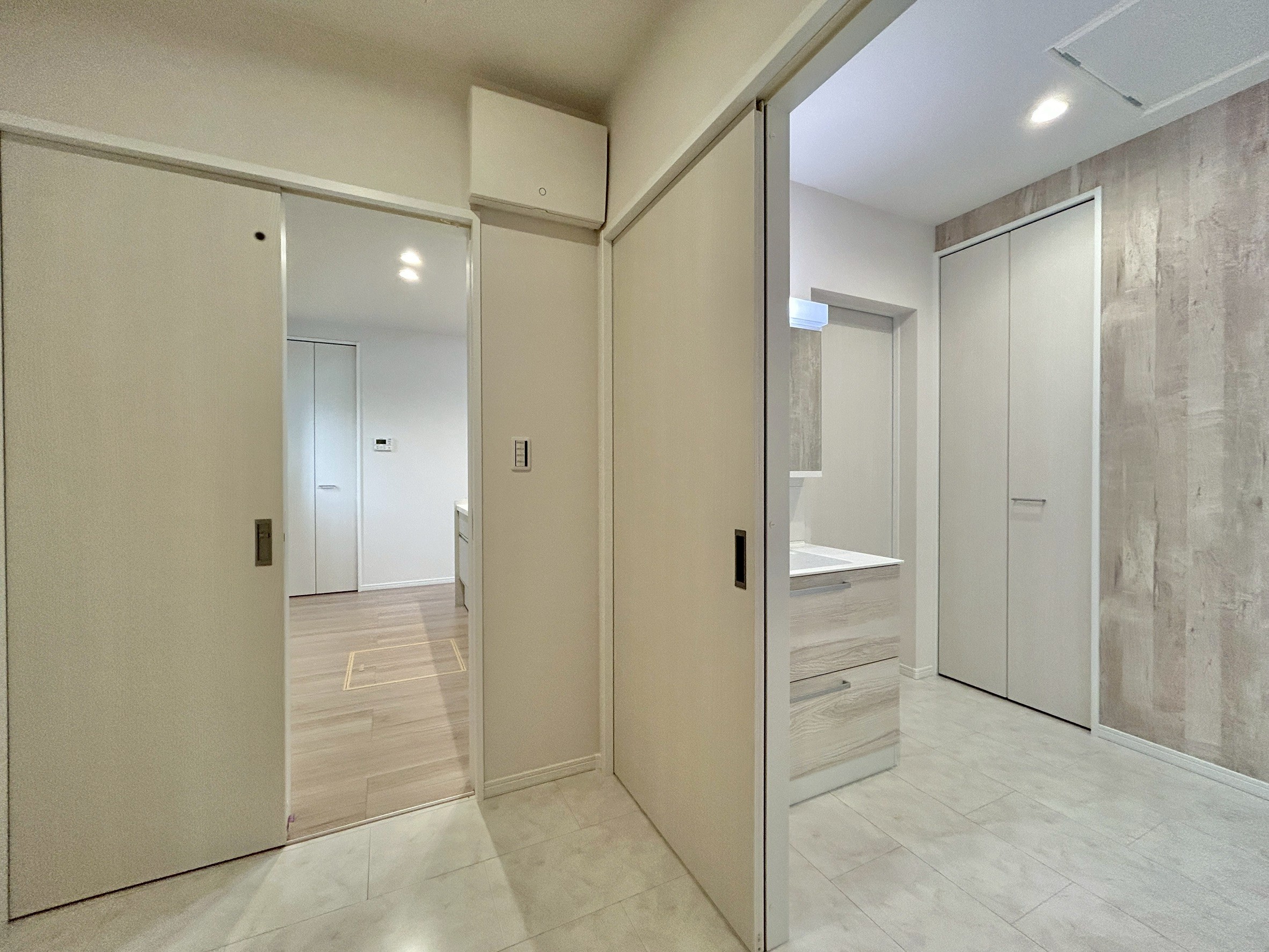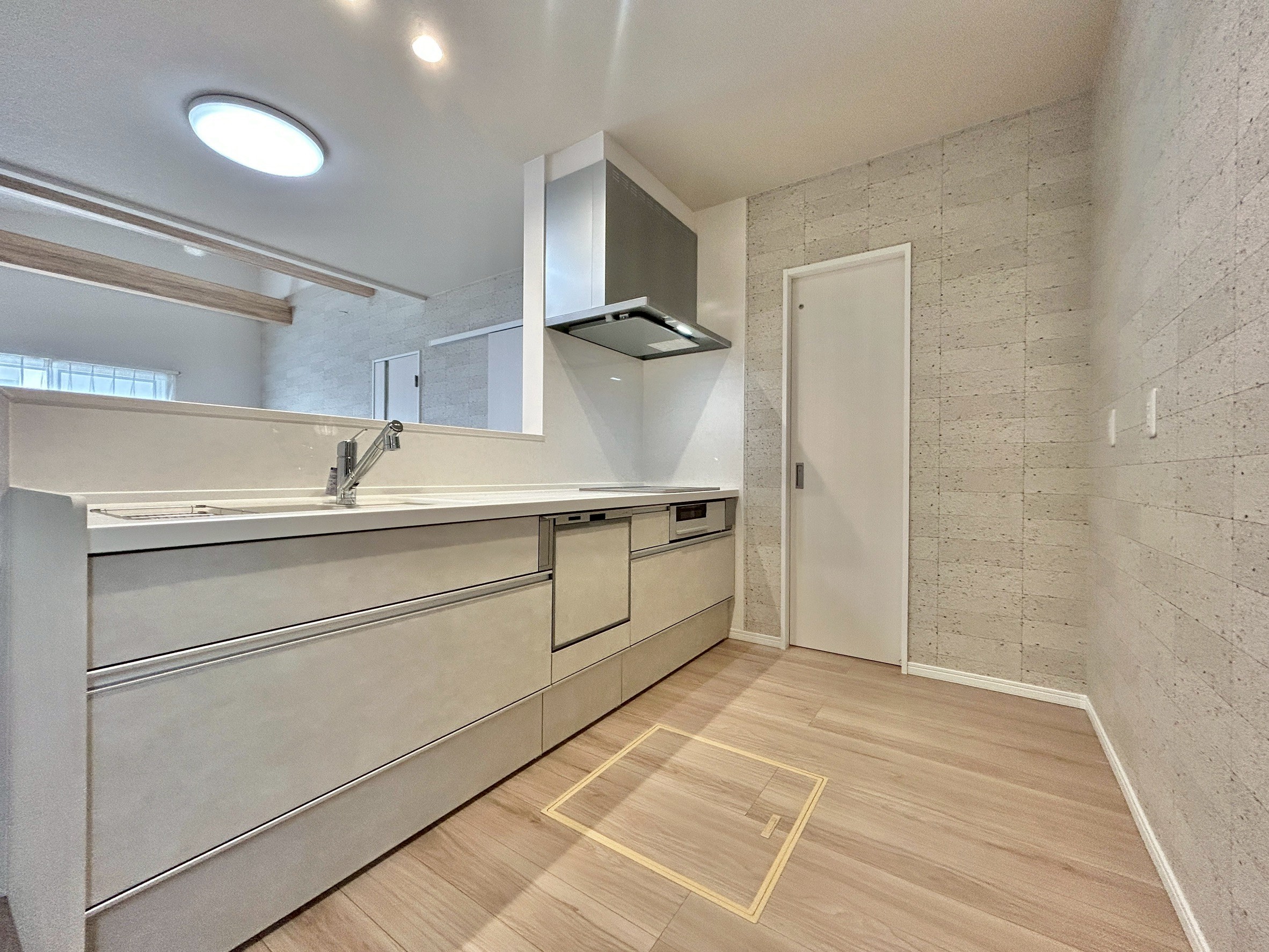- キッチン→脱衣室→洗面室→廊下がぐるりと回遊できる動線設計で、家事の効率もアップ。家族の移動もスムーズでストレスフリー。