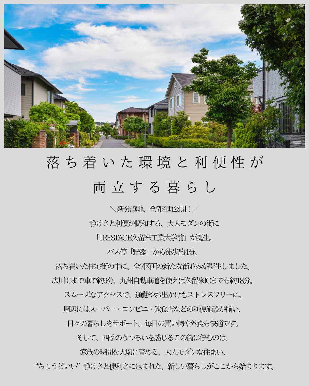 全7区画の分譲地には、それぞれ異なる魅力を持った住宅が建ち並び