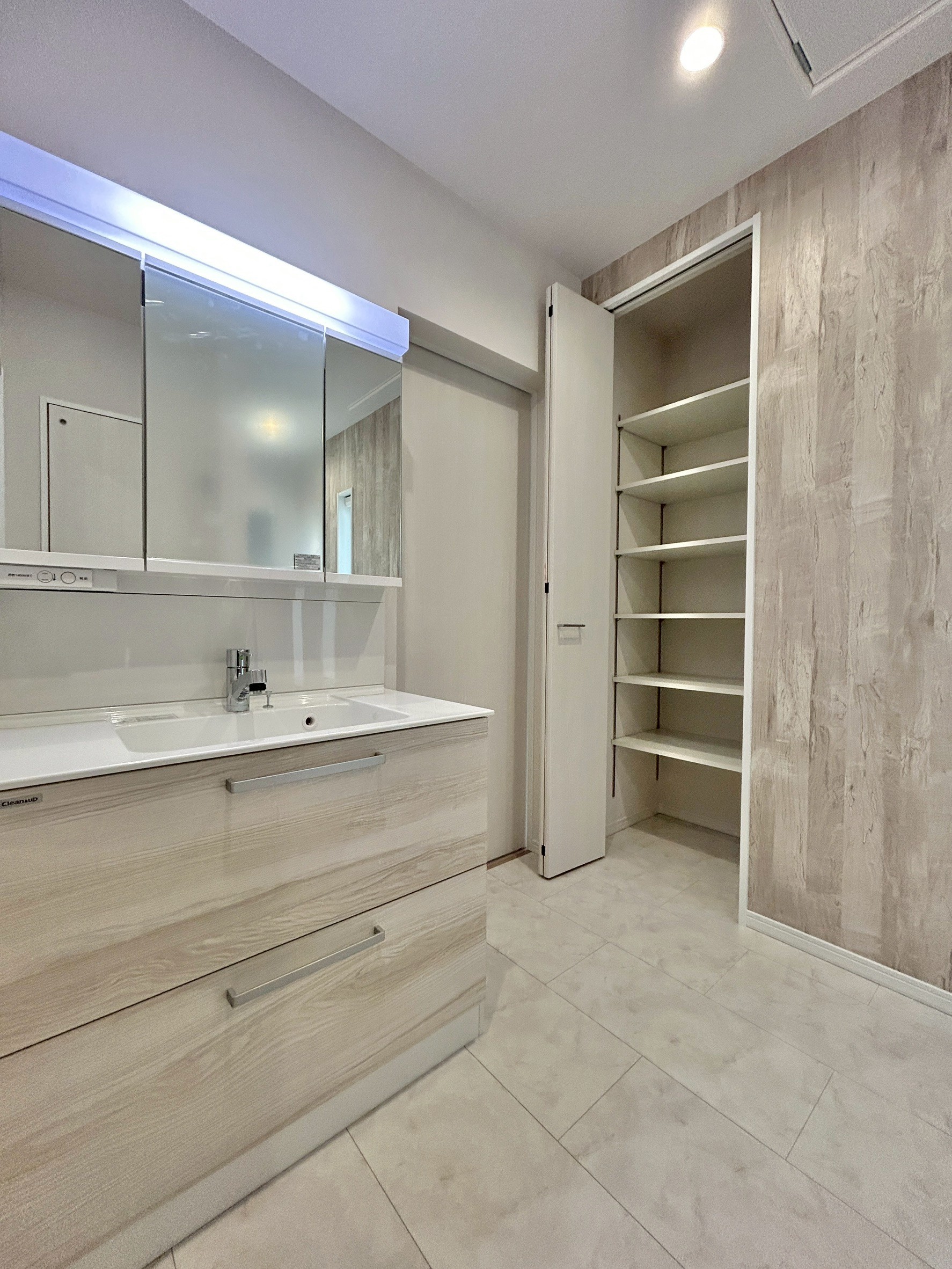 キッチン→脱衣室→洗面室→廊下がぐるりと回遊できる動線設計で、家事の効率もアップ。家族の移動もスムーズでストレスフリー。