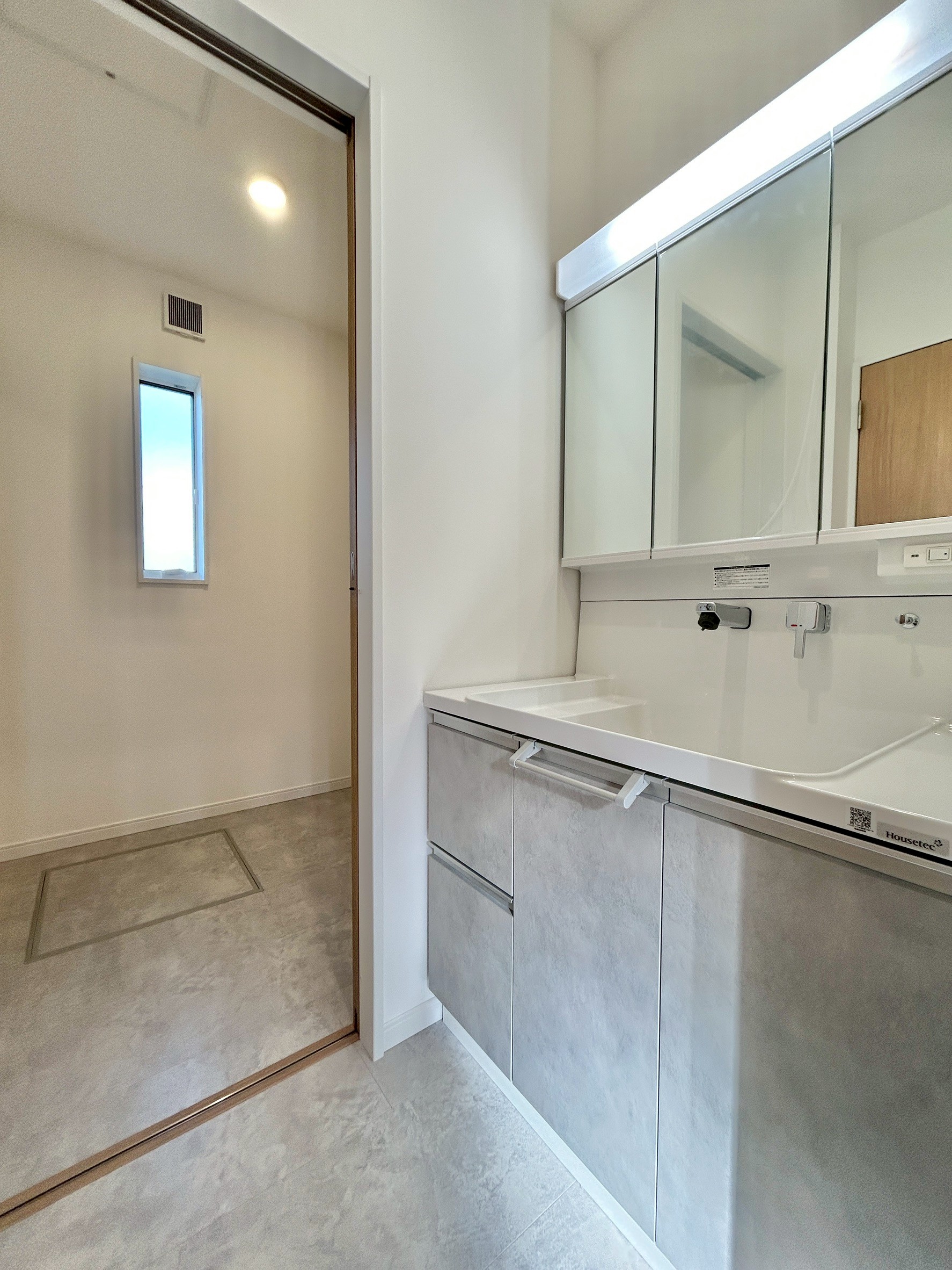 玄関から洗面室・脱衣室・浴室までをスマートに集約。帰宅後の手洗いや朝の支度、洗濯動線まで考え抜かれた機能的プラン。