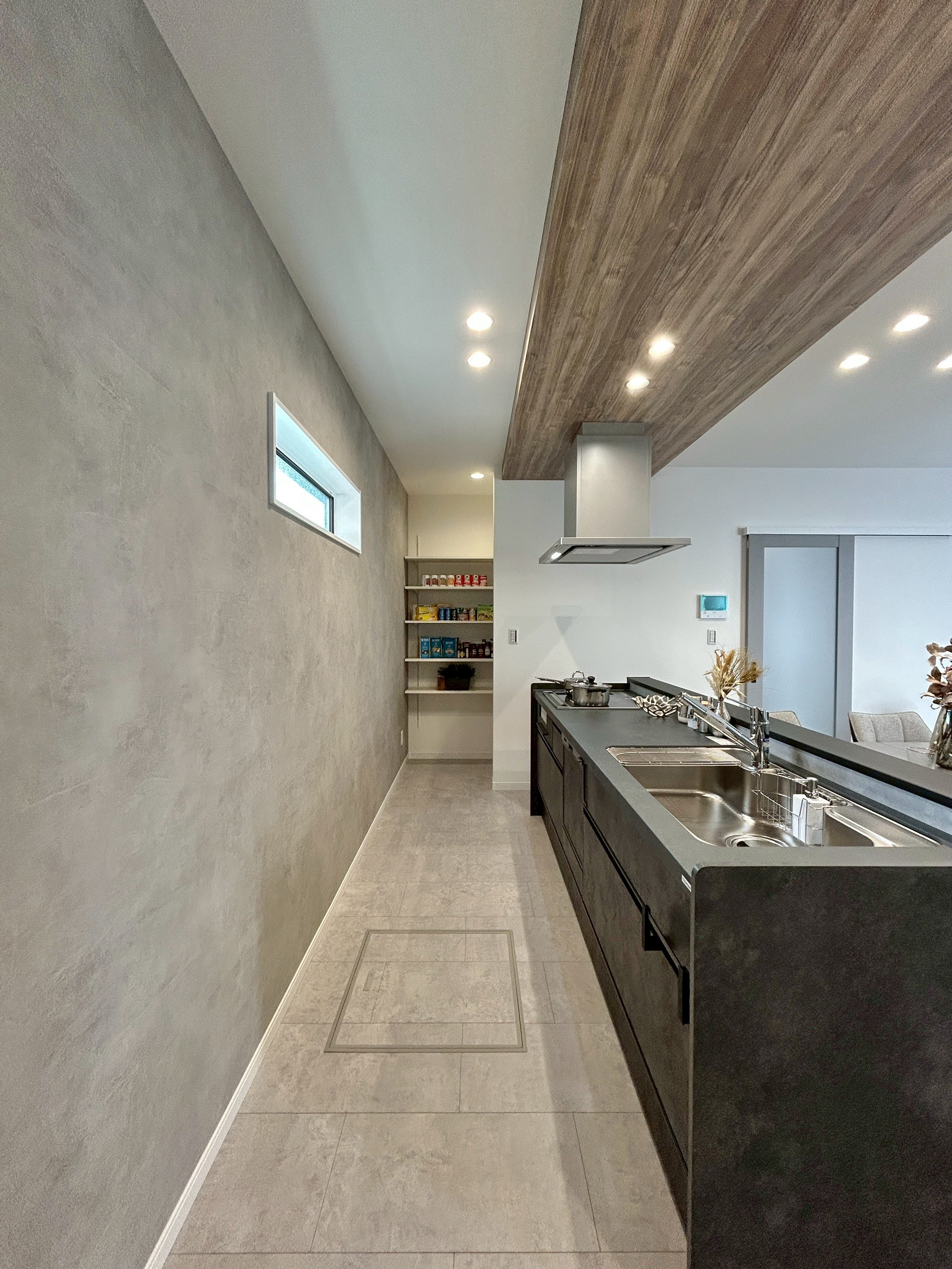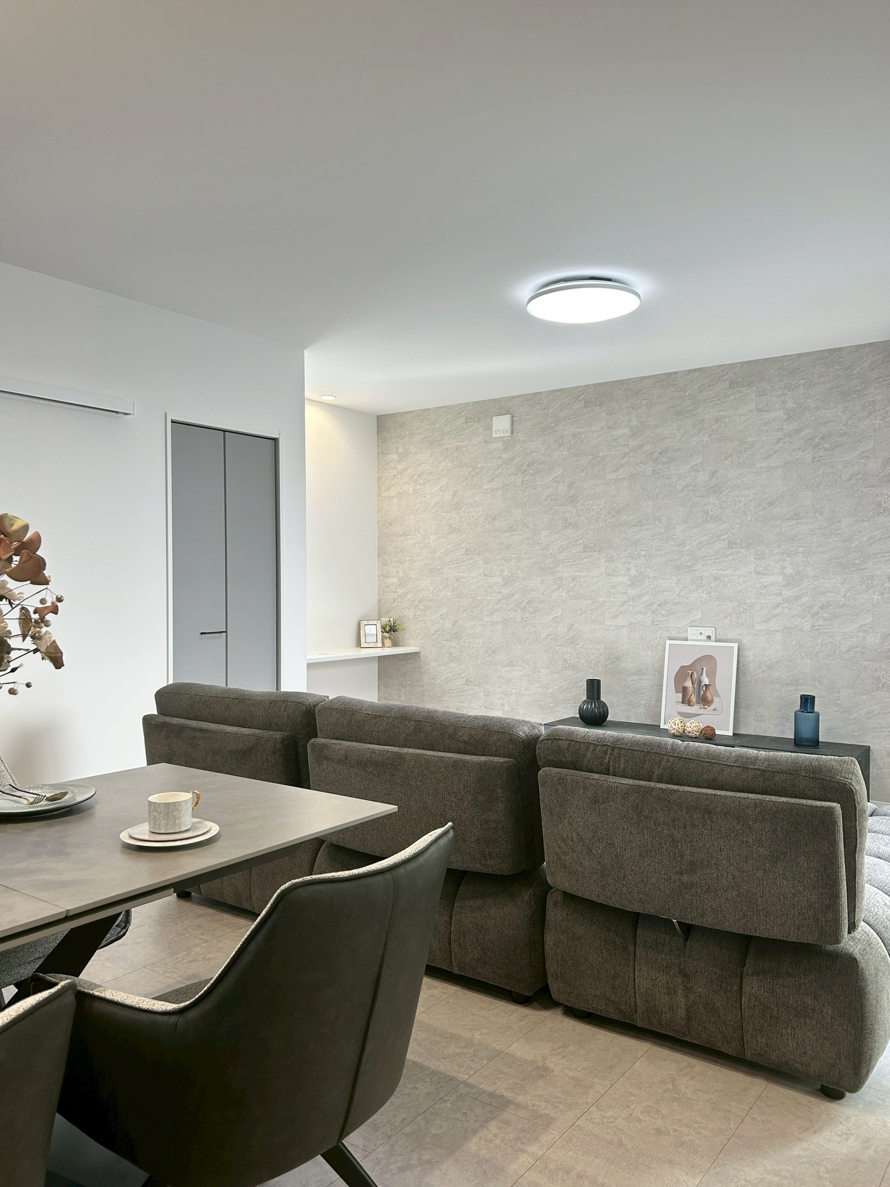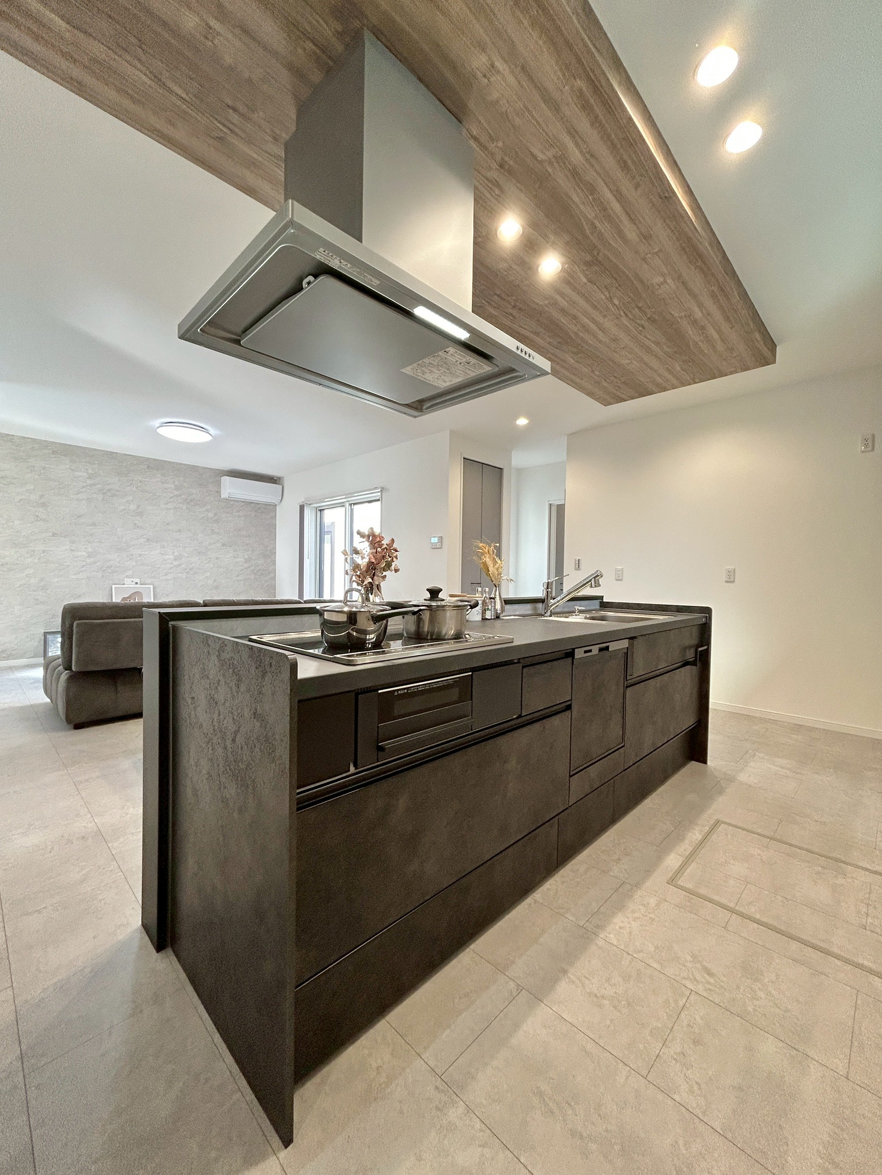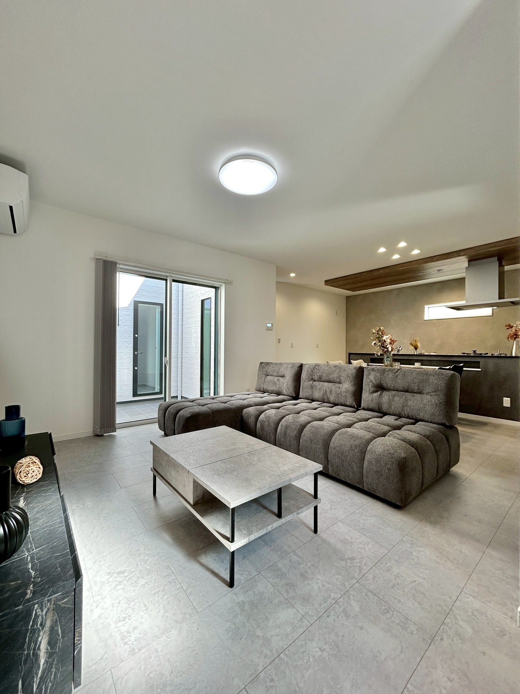 空間に上質感を与える、石目調のフロアデザイン。落ち着いた色味と素材感が、ホテルライクな内観と調和し生活感を抑えた洗練された空間を演出