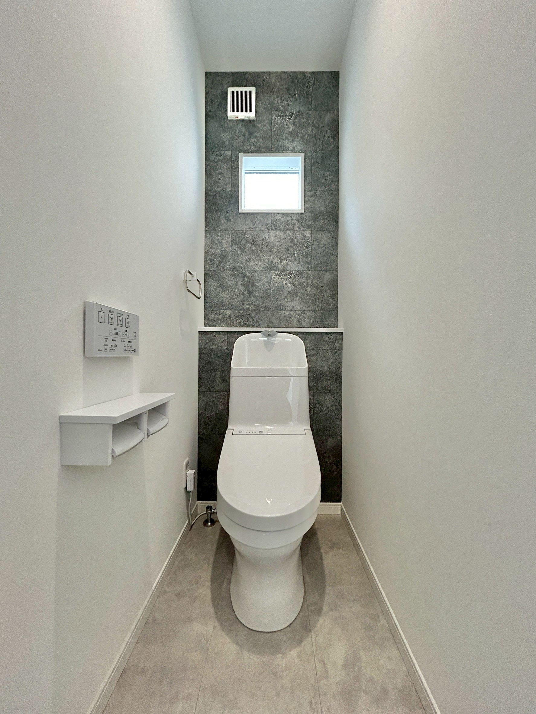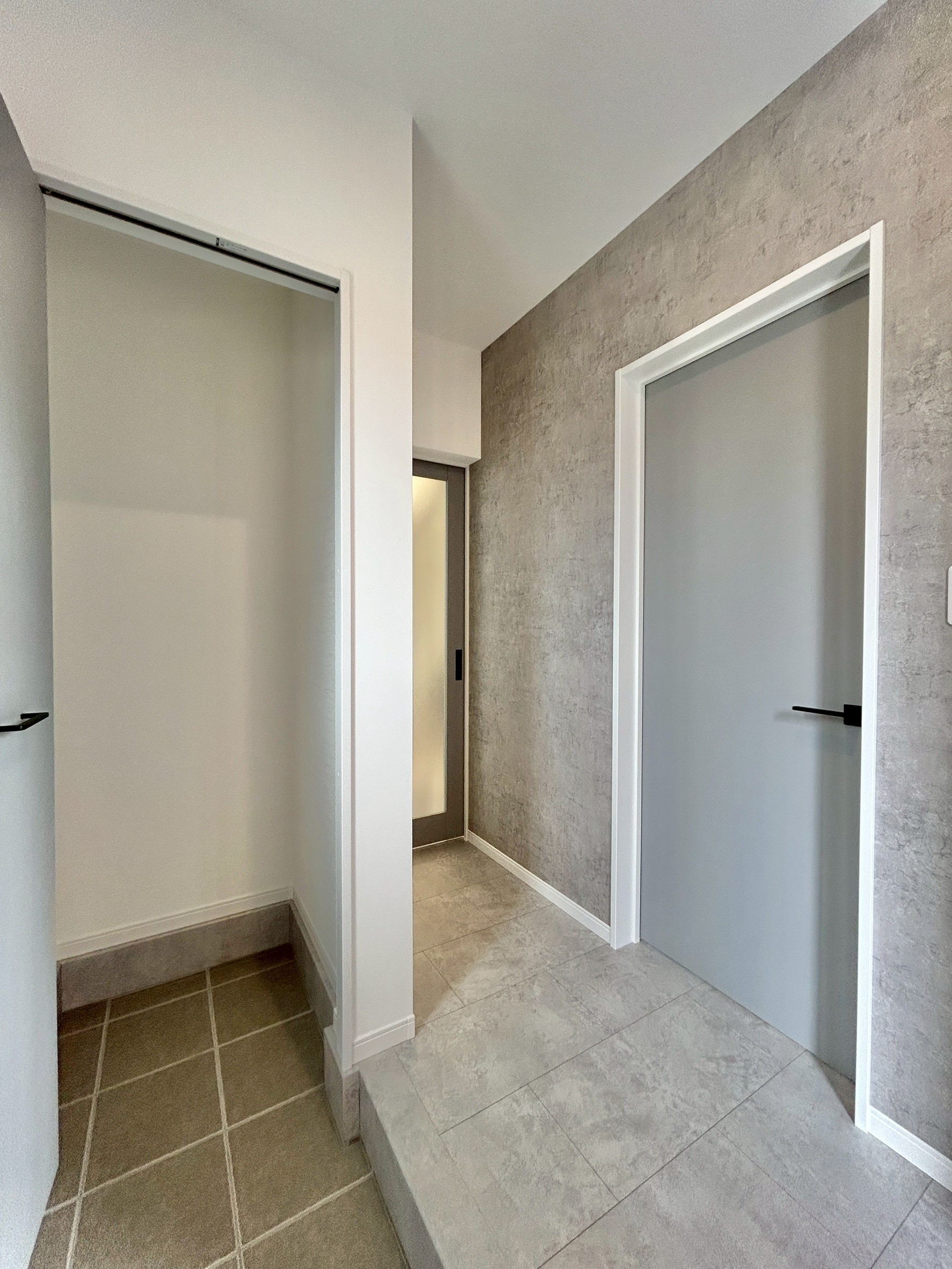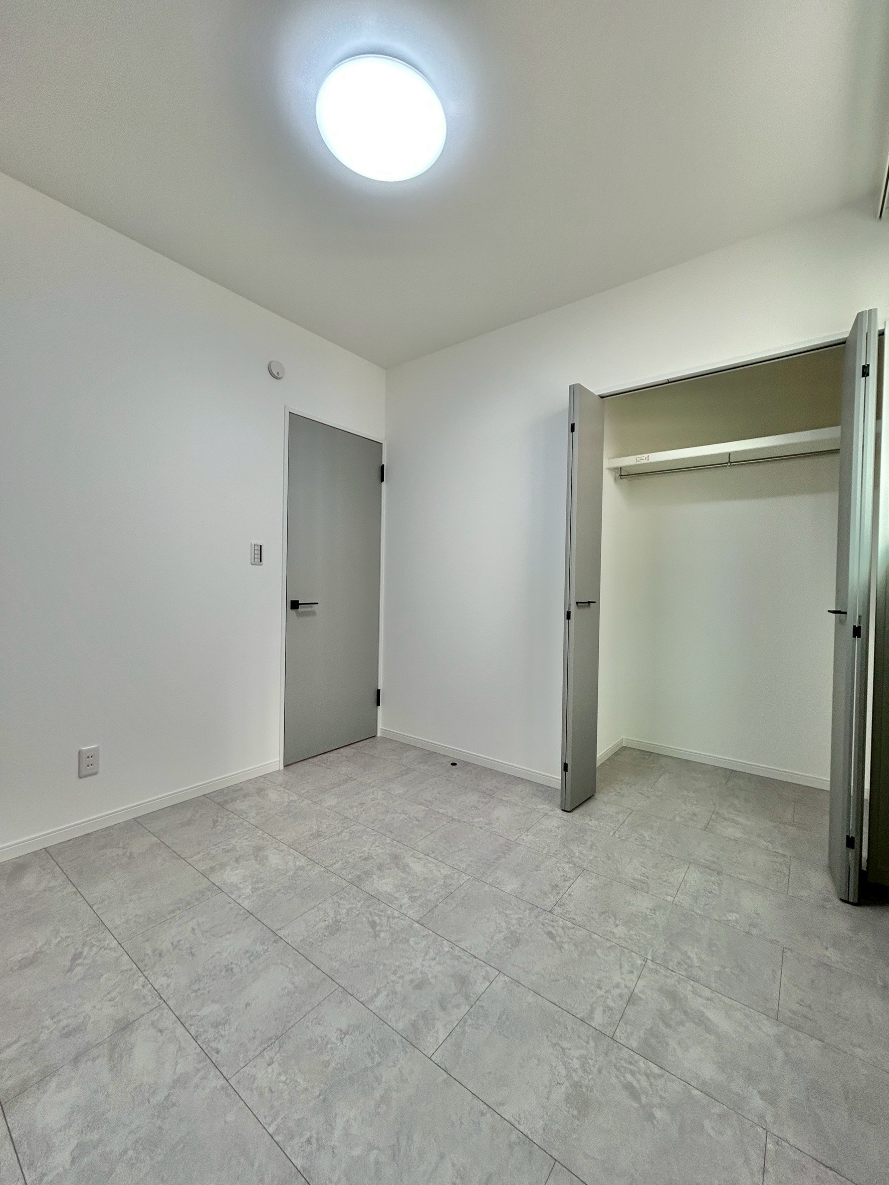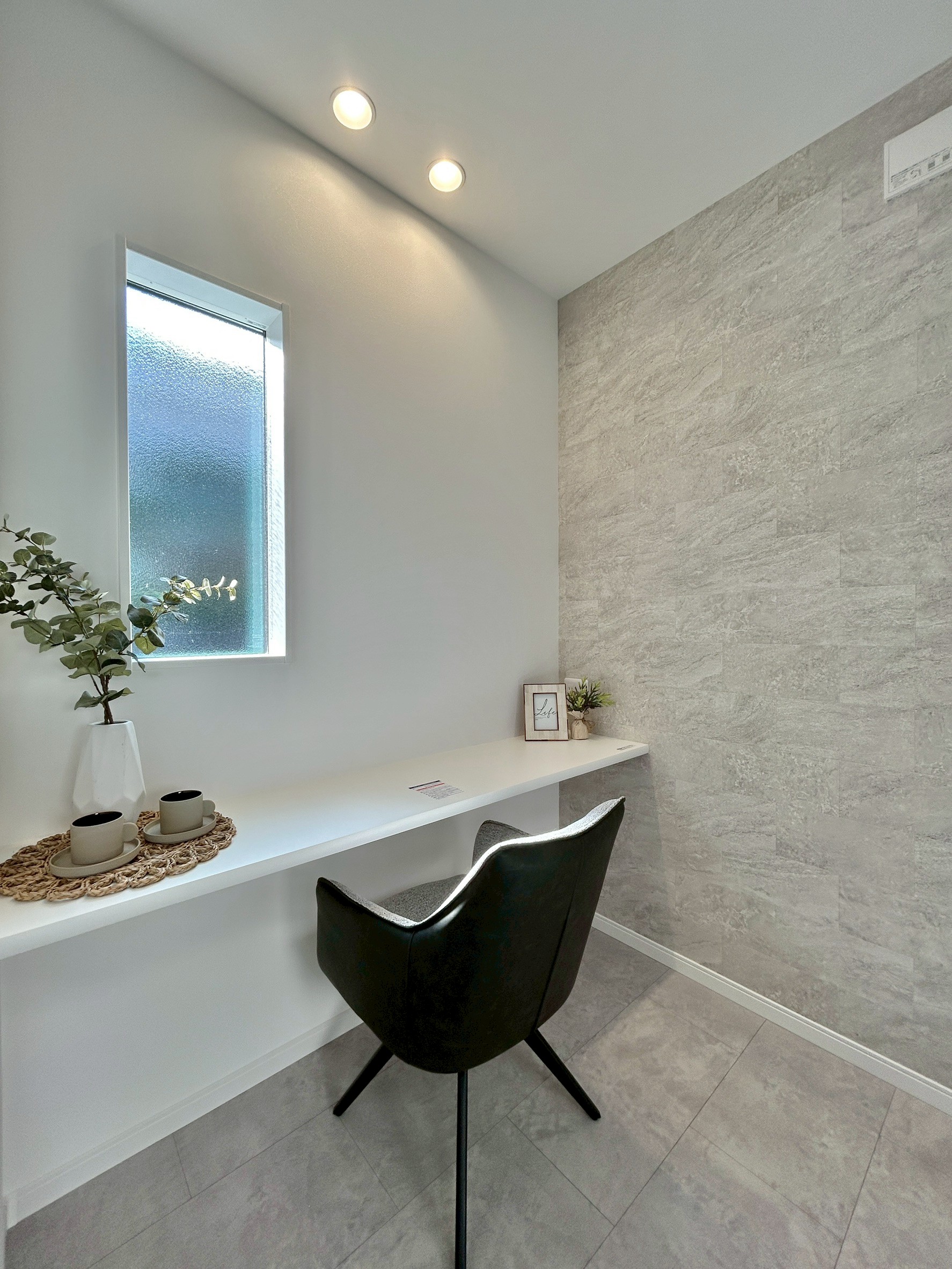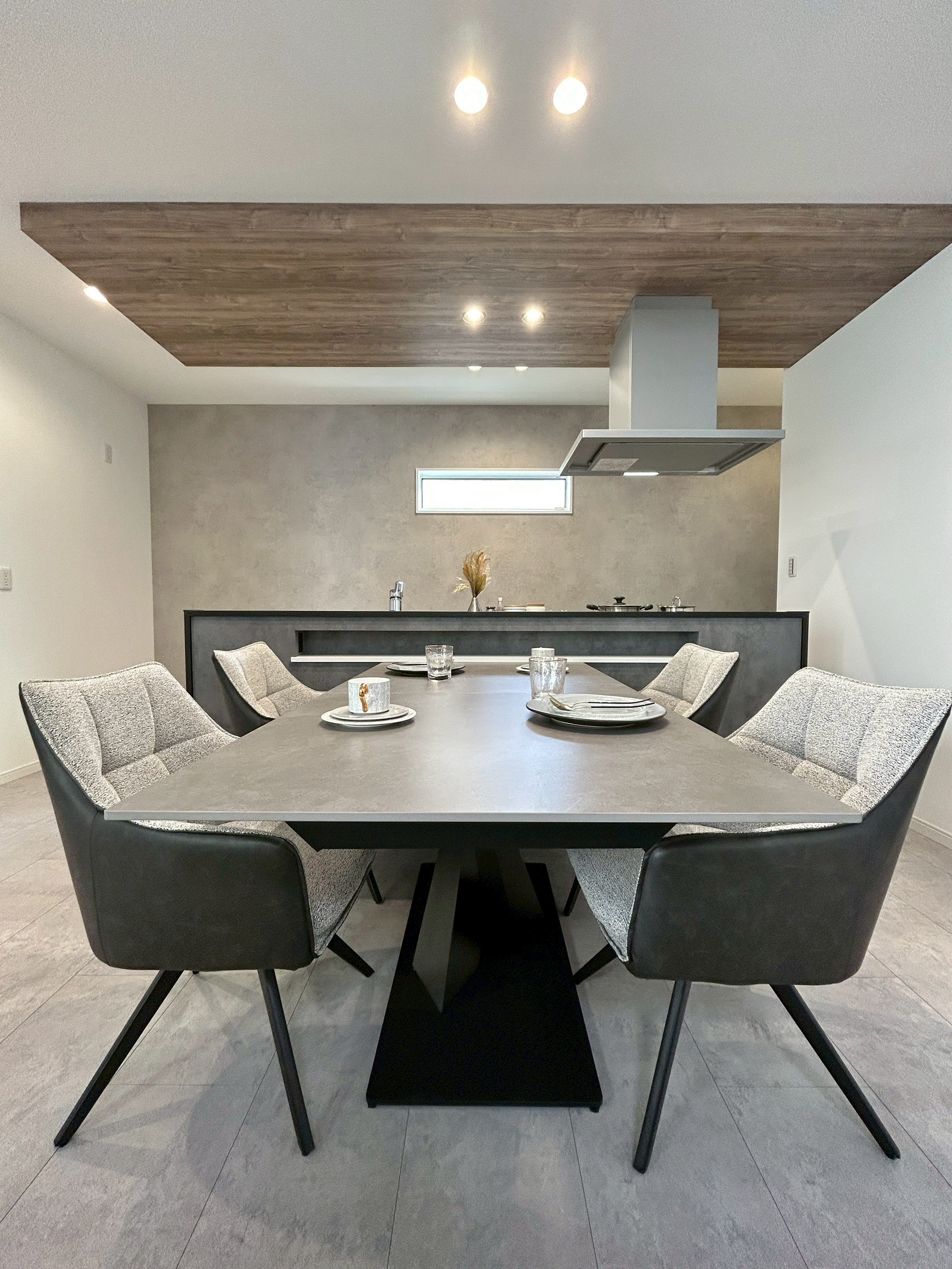 空間に上質感を与える、石目調のフロアデザイン。落ち着いた色味と素材感が、ホテルライクな内観と調和し生活感を抑えた洗練された空間を演出