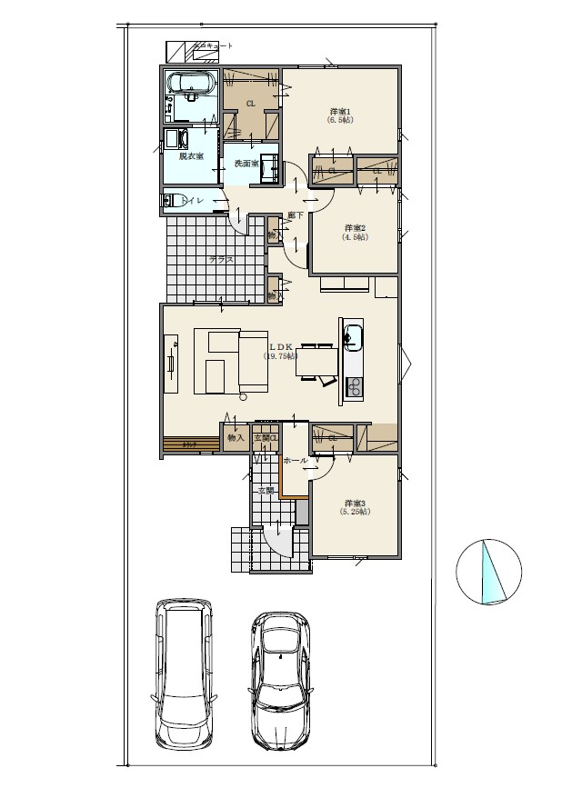 6.5帖・5.2帖・4.5帖の洋室を配置。主寝室+子ども部屋や書斎など、暮らしに合わせて使い分けできる設計。