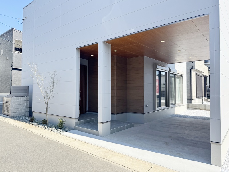 雨の日の車や自転車の乗り降りがラクラク♪白と木目調の外観が目を引くデザインです。