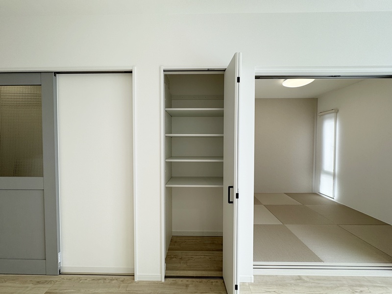 2階廊下に収納を2つ設け、家族共有で使える収納力をプラス。各居室の収納を圧迫せず、すっきりとした住空間を保てます。