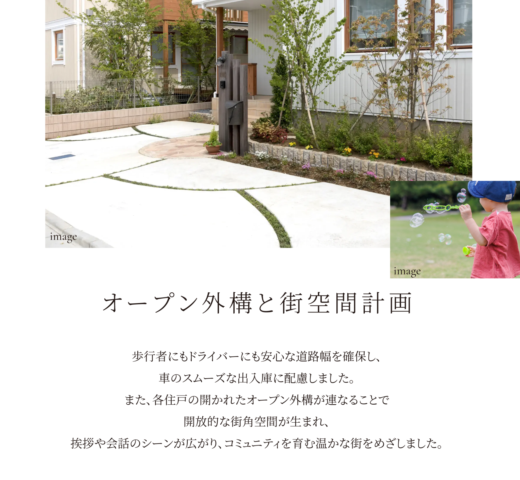 開放的なオープン外構など、住まう方同士のコミュニティを育むタウンプランニングです。