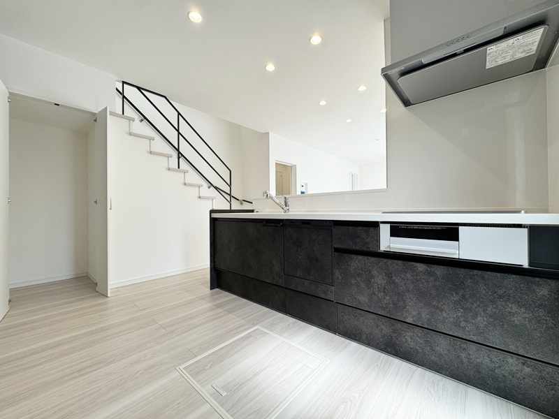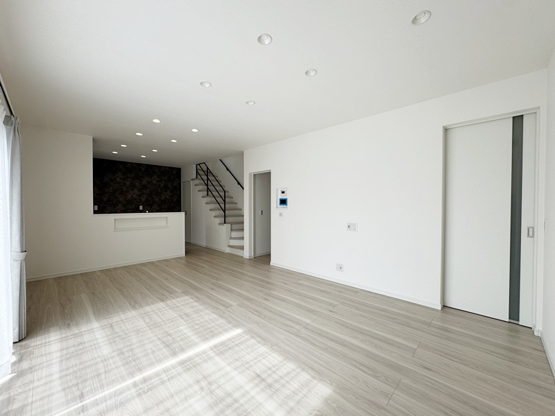 南向きの明るい18.5帖のLDK。キッチン横にダイニングテーブルを配置できるので、配膳もスムーズにできます。キッチンからリビング全体を見渡せるので、小さなお子様がいらしても安心して過ごせます。