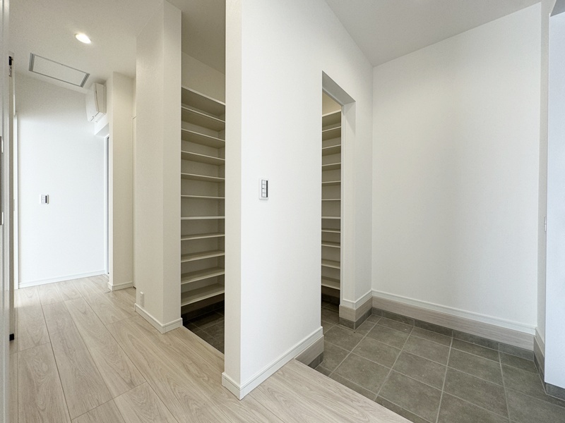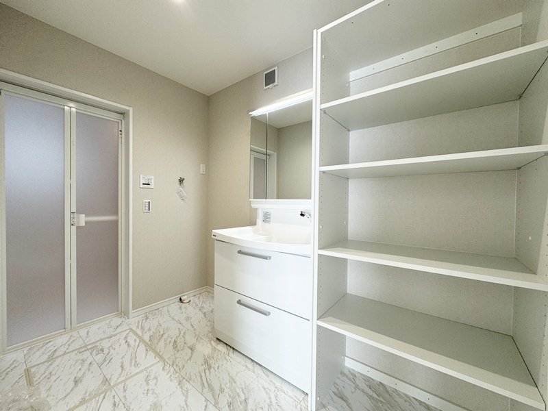 シューズクロークやウォークインクローゼットを完備!洗面脱衣室にも可動棚があり、スッキリ収納できるよう工夫されています。