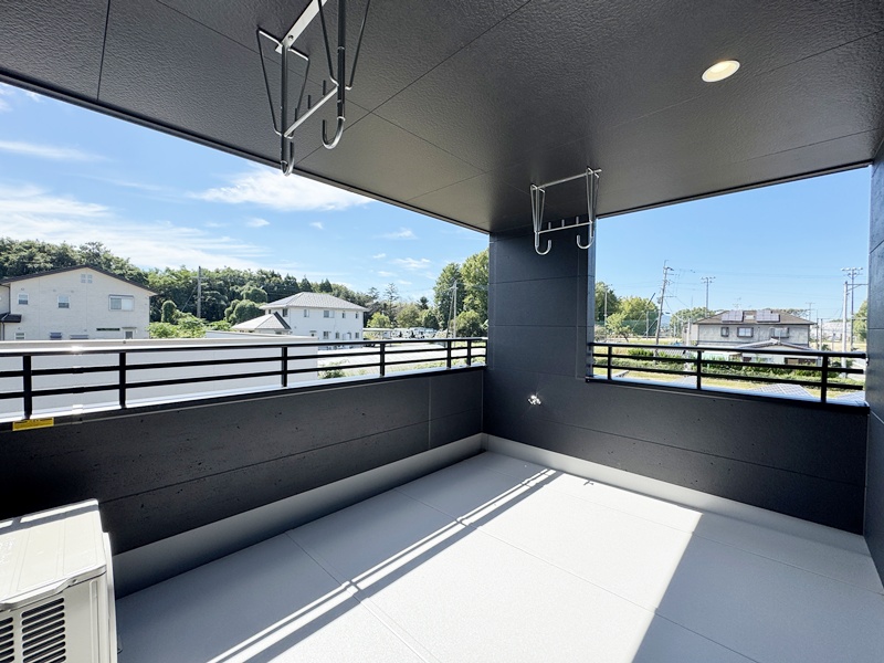 - バルコニーは広々としており、屋根付きなので洗濯物を干すのに最適なスペースです。急な天気の変化でも心配なく洗濯物を干すことができます。水栓付きなのでお掃除も簡単にできます。