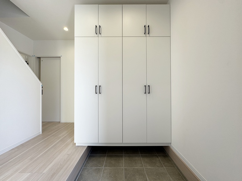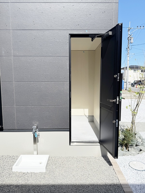 - 随所に収納スペースをたっぷり設けました。シューズクロークや1階にもウォークインクローゼットを完備。外部収納もあり、モノの移動を最小限に抑えられるので、サッと片づけられます。