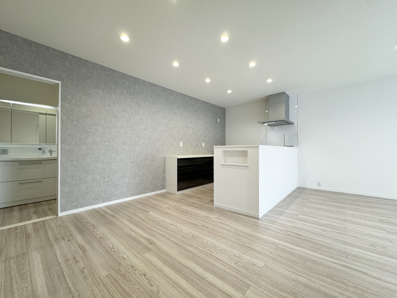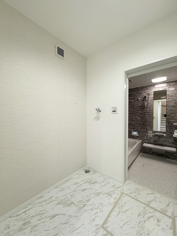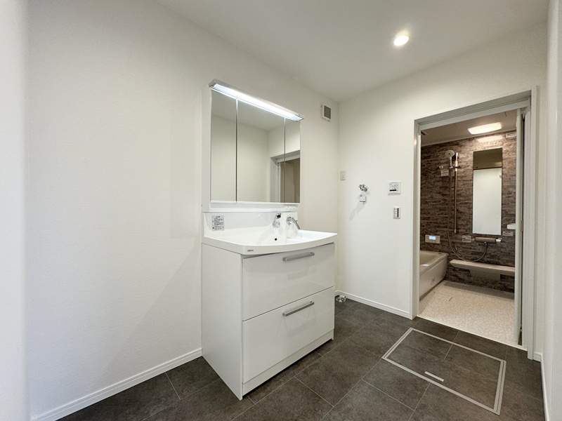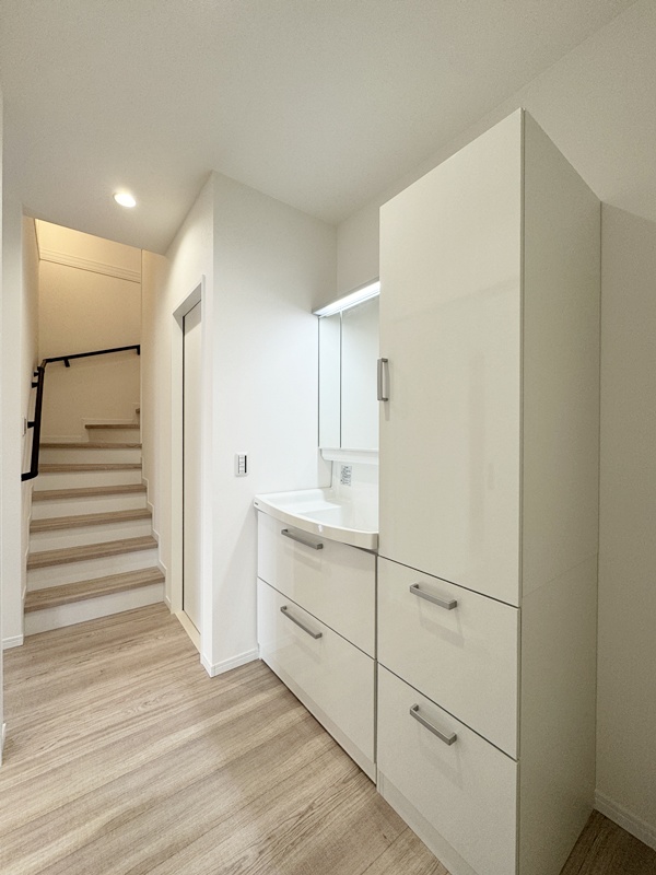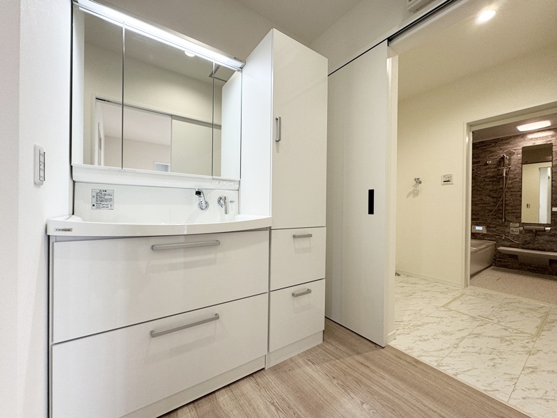- 洗面室と脱衣室を分け、さらに浴室まで横並びに配置したことで使いやすさがぐんとアップ。身支度・洗濯・入浴の動線が一直線になり、家族の生活リズムが重なる時間帯でもスムーズに使えます。プライバシーを守りながら快適さも両立した、毎日の家事をラクにしてくれるポイントです。