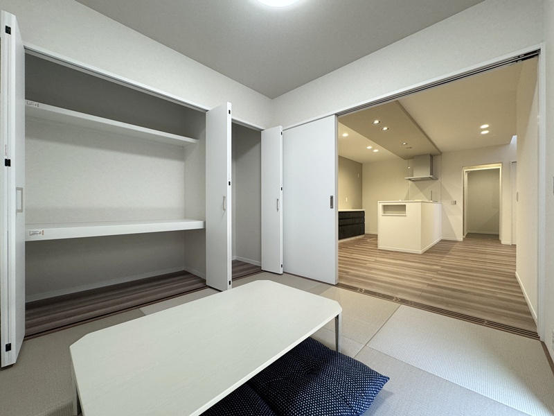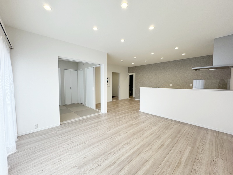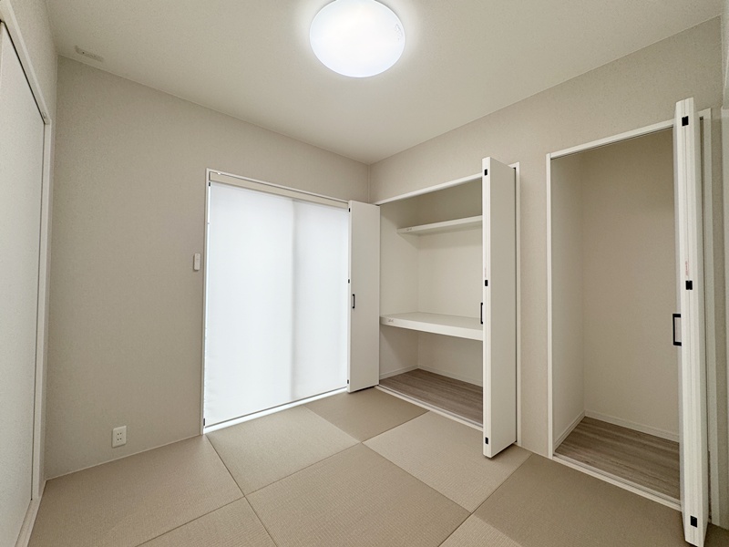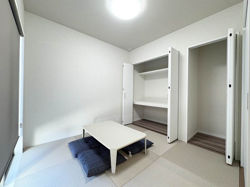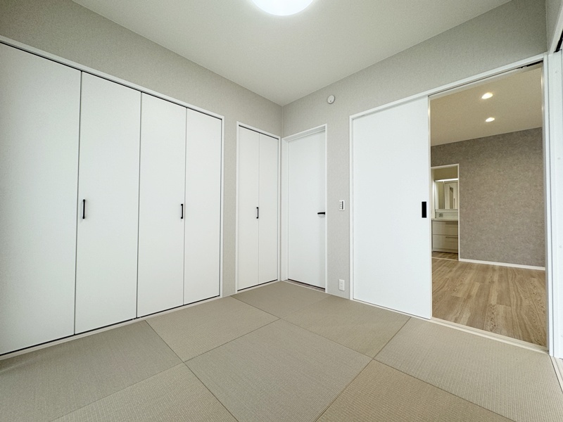 - 和室は玄関側とリビング側の2方向から出入りできるつくりに。来客をそのまま和室へ案内しやすく、家族はリビングから気軽に使える便利な動線が魅力です。用途に使い合わせて使い分けでき、日常にも来客じにも活躍します。
