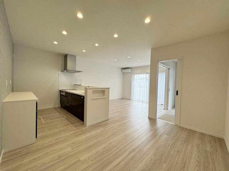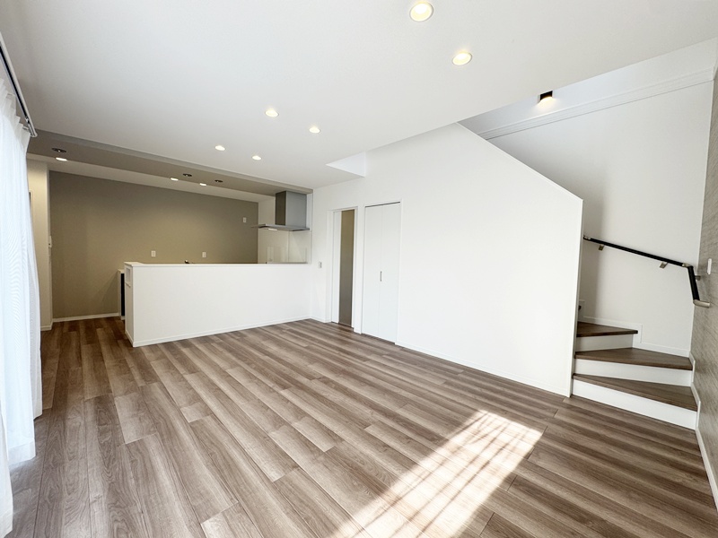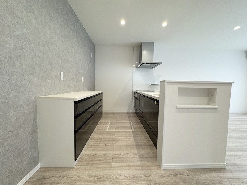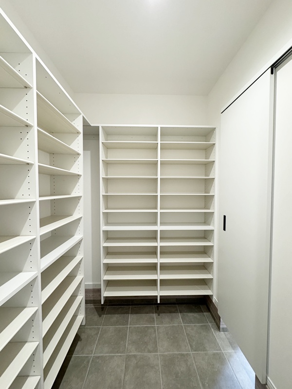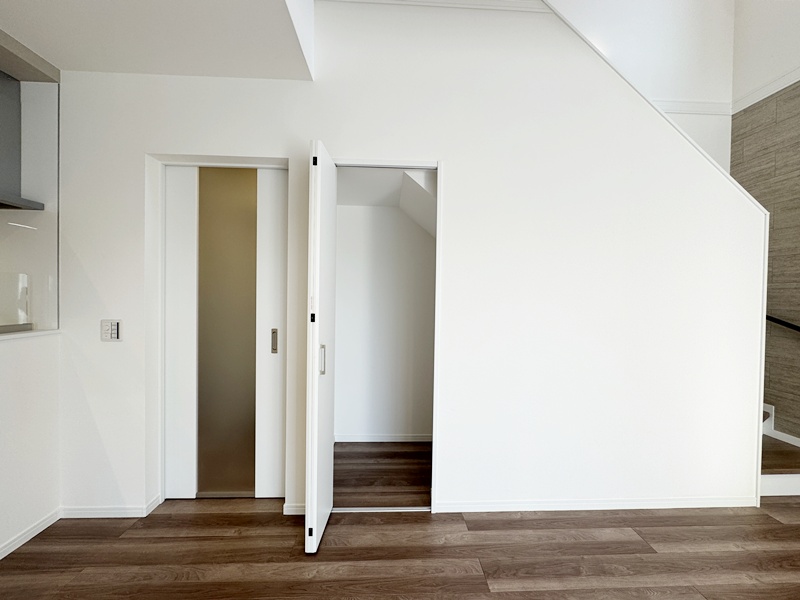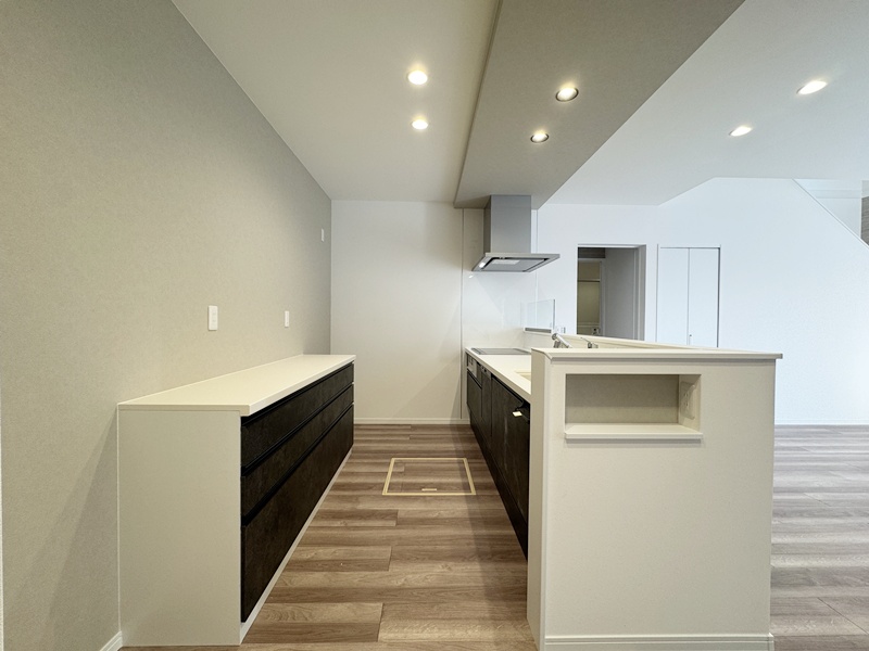 - キッチンの後ろには、収納力たっぷりのカップボードを完備。食器や調理家電をすっきりとまとめられるので、調理スペースがいつでも広く使え、家事の流れもスムーズに。見た目も整い、毎日の料理がちょっと楽しくなるポイントです。