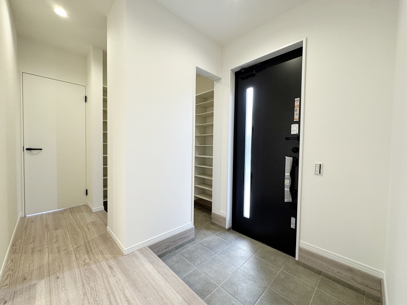 - 玄関はゆったりと広く設け、その横には便利なシューズクロークをも配置。靴はもちろん、ベビーカーやアウトドア用品までまとめてしまえるため、玄関まわりがいつでもスッキリ。来客時にもゆとりを感じられる、暮らしやすさと見映えの両方を叶えます。