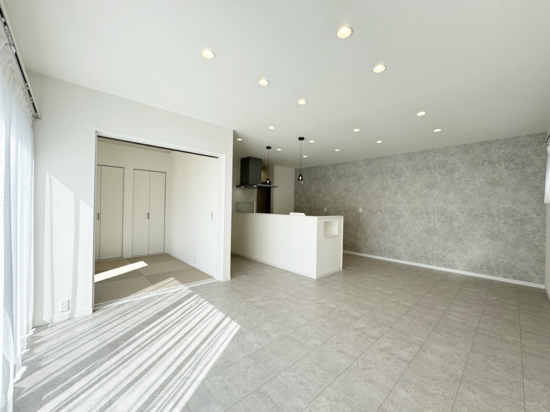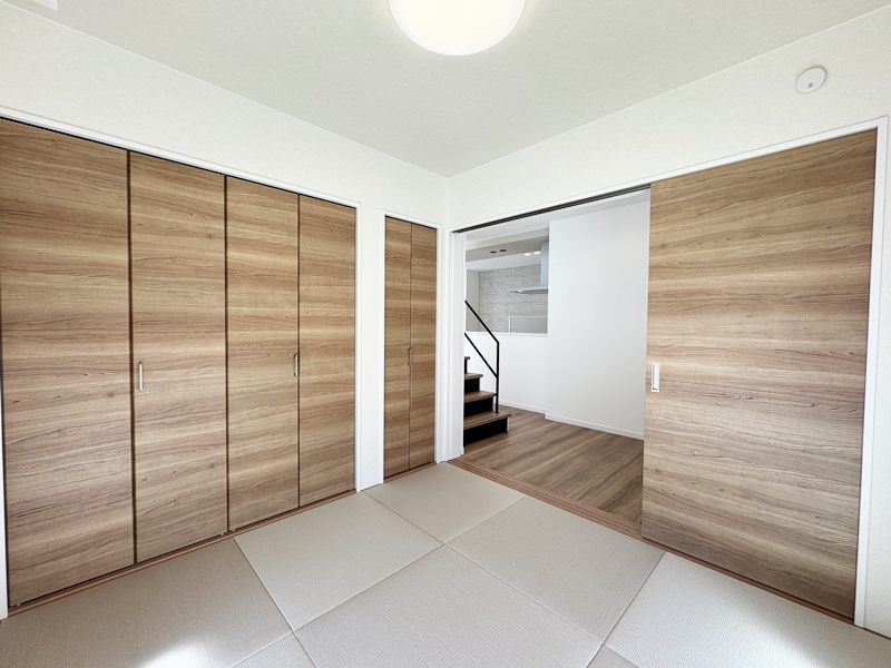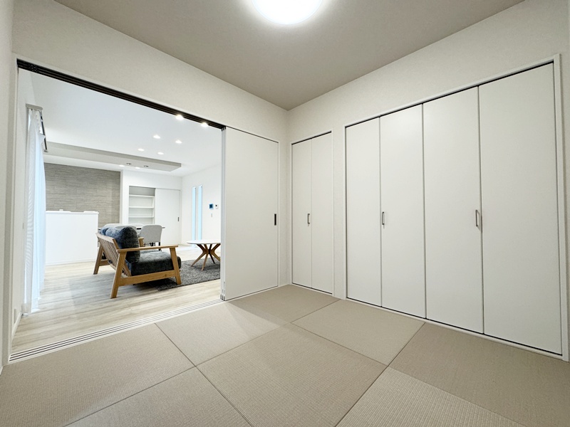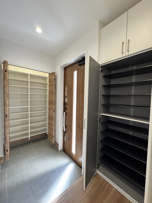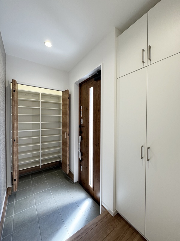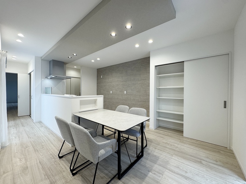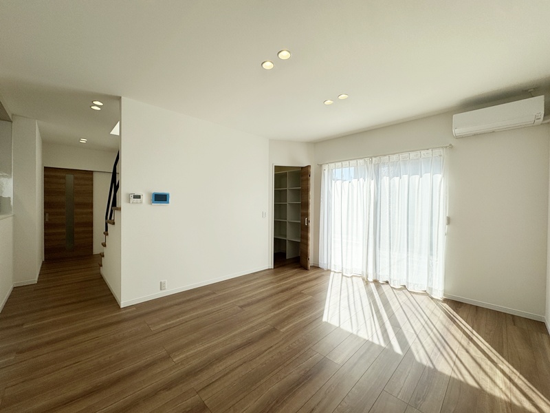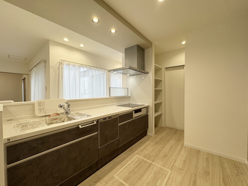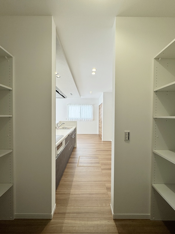 - キッチン横には広めのパントリーとして使える物置を設置。食品ストックはもちろん、調理家電や日用品の収納にも便利で、生活感を抑えたすっきりとした空間づくりが可能です。毎日の家事をスムーズにサポートします。