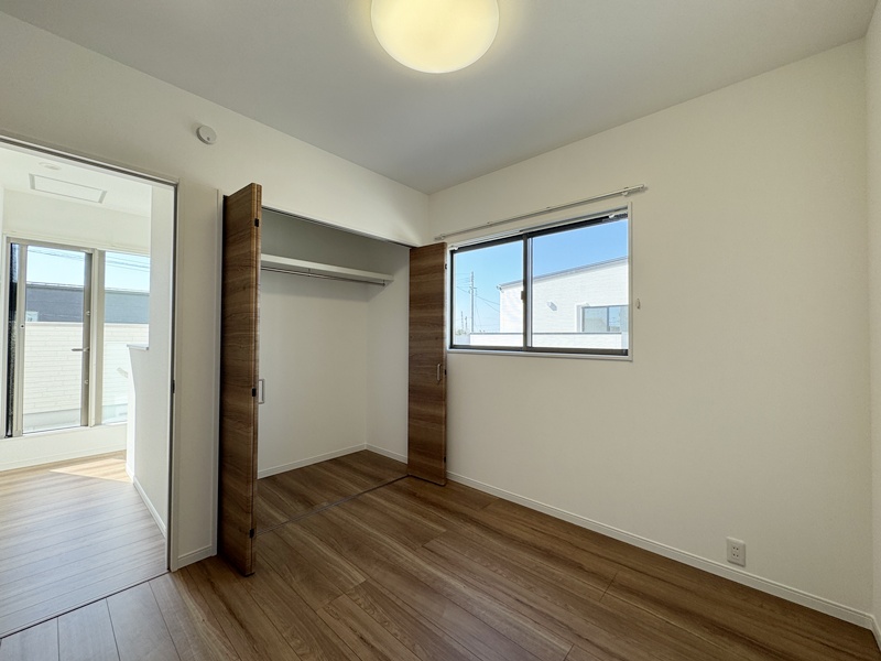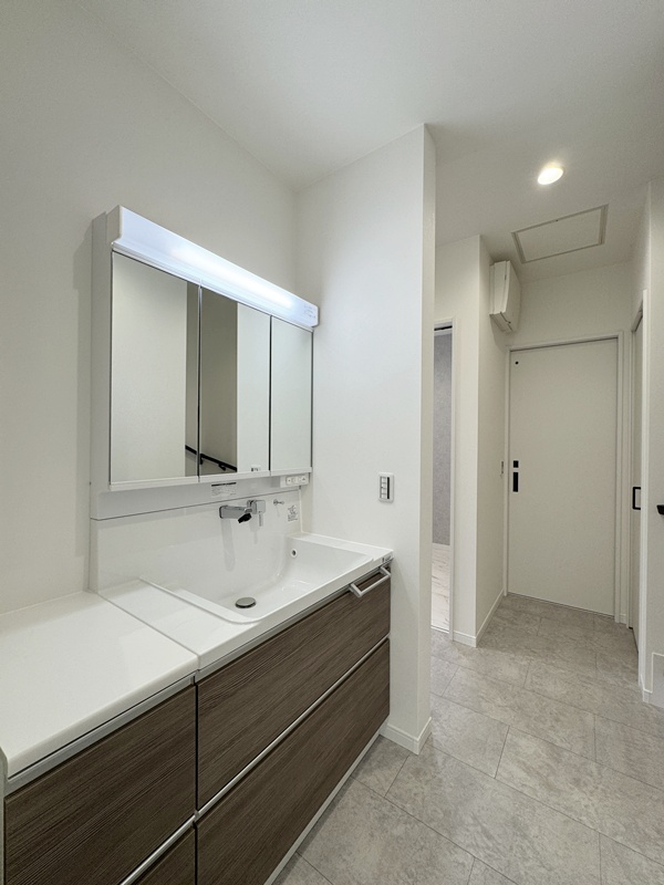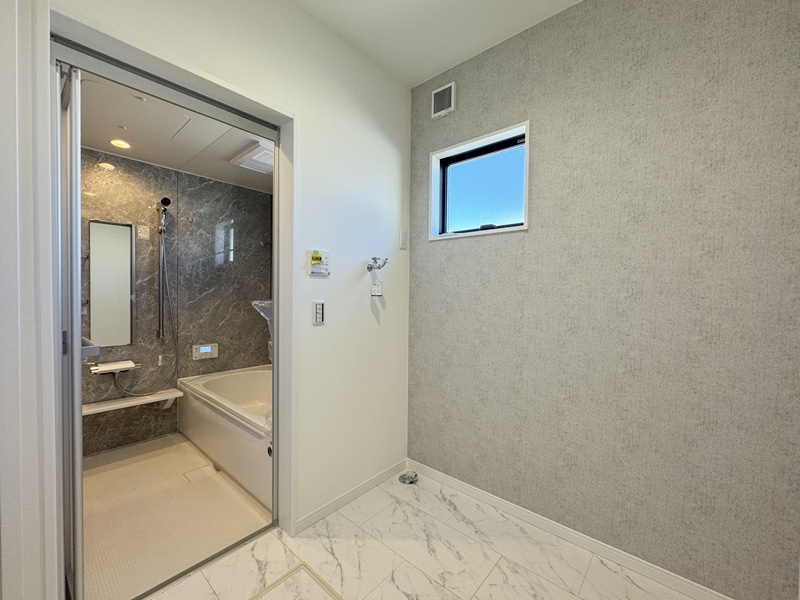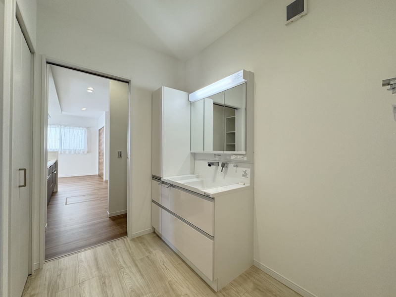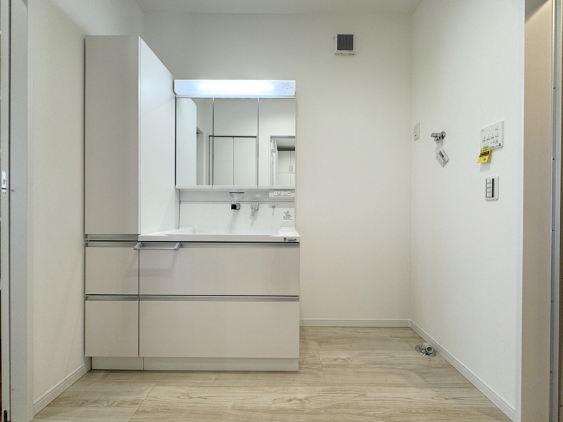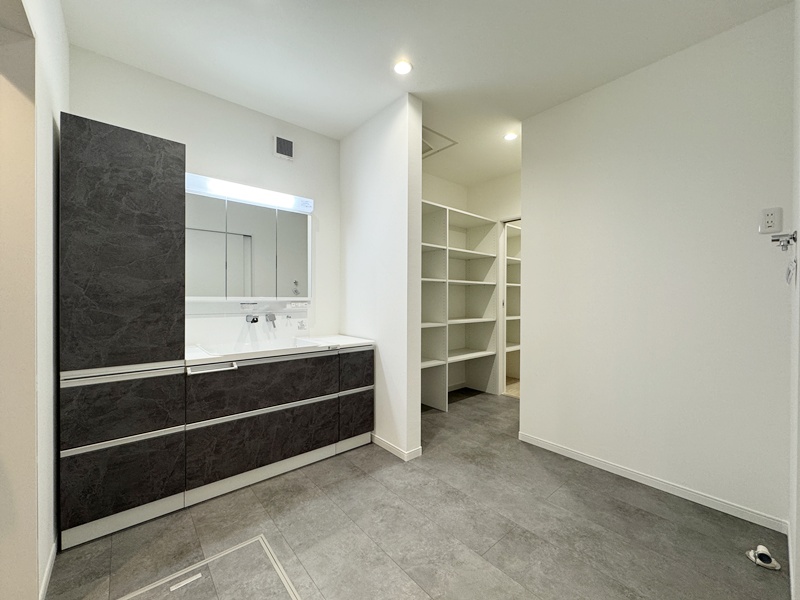 - 洗面室脱衣室と隣接したファミリーローゼットで、生活動線を効率化。衣類やタオル類もまとめて収納でき、空間をすっきりと保てます。機能性と快適さを兼ね備えた動線設計です。