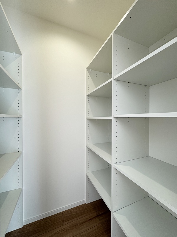 - キッチン横に、両サイド収納可能な稼働棚付きパントリーを設置。食品や日用品をたっぷり収納でき、使う人や物に合わせて高さ調節可能。