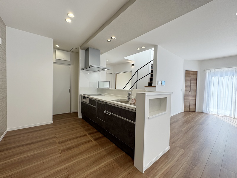 - キッチン前に階段を配置することで、家事をしながら家族の動きが自然と目に入る間取りに。帰宅や外出時の動線もスムーズで、日々の暮らしに安心感とつながりをもたらします。
