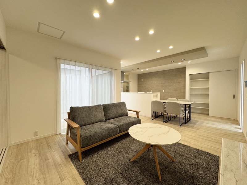 - 中庭を望む開放的な19.5帖のLDK。家族でプライベートな時間をのんびりと楽しめる空間です。