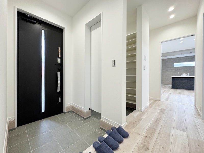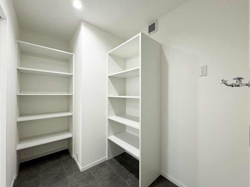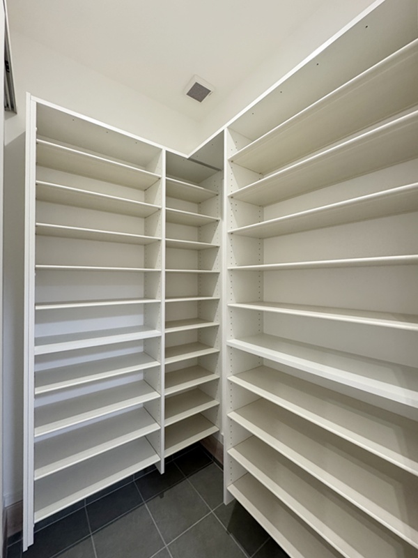 - キッチン横にすぐパントリーを設けたので、買い置きした食材やキッチン用品もサッと取り出せ、家事の効率がぐんとアップします。収納力が抜群なので毎日の調理や片付けを快適にしてくれます。