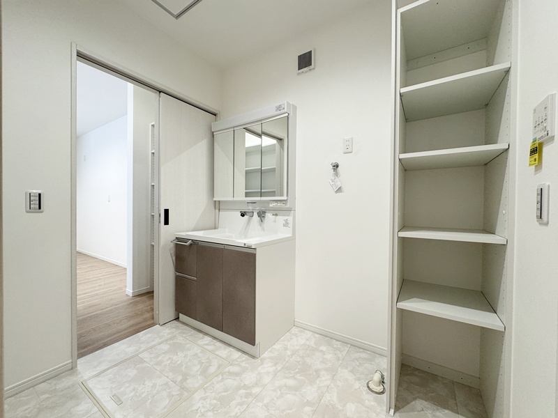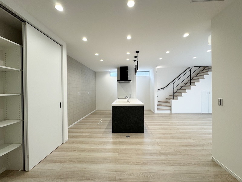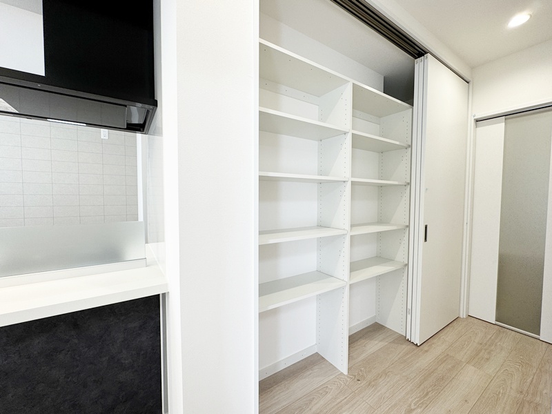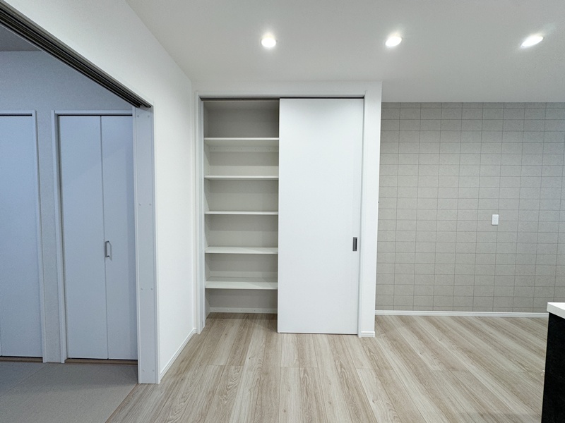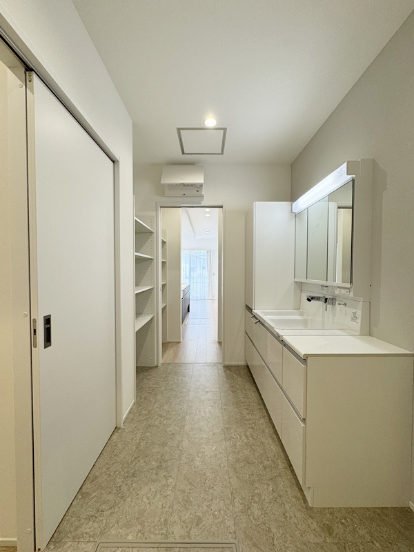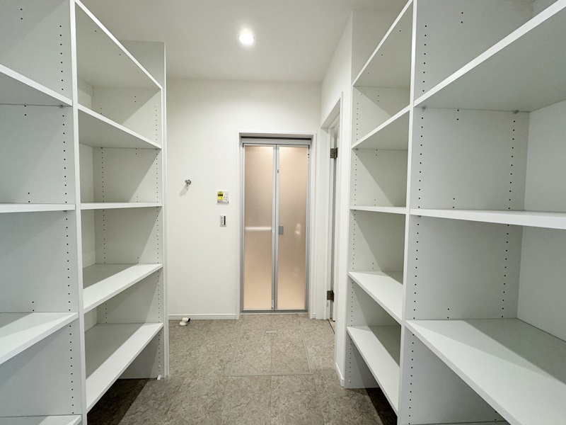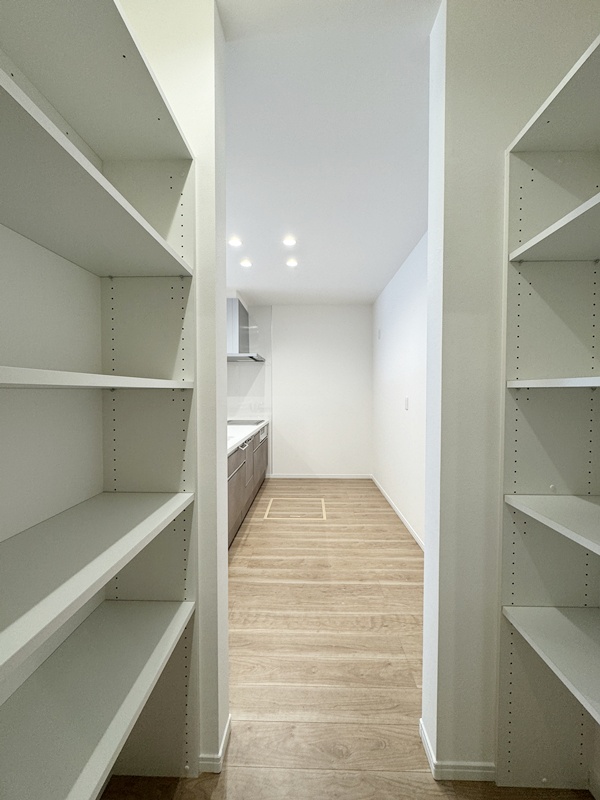 - パントリー横から洗面脱衣室に行けるので、お子さまのお風呂上げをお料理中でもスムーズに行くことができ、家事もしやすくなっています。