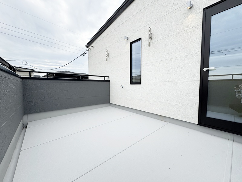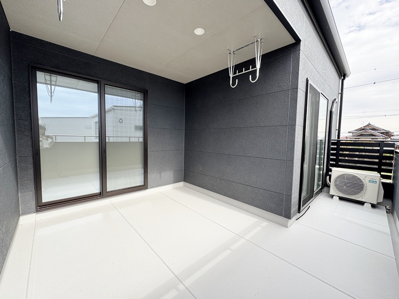 - 屋根付きの広いバルコニーは2階廊下からも出入りができ、外干し派にも便利な間取です。