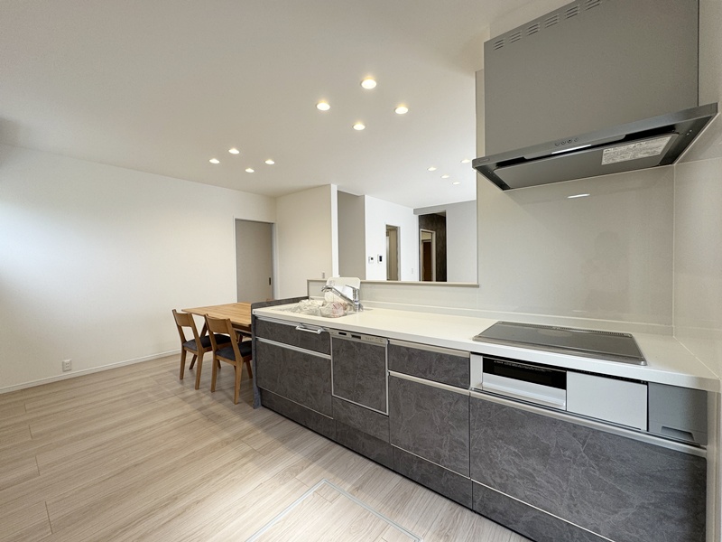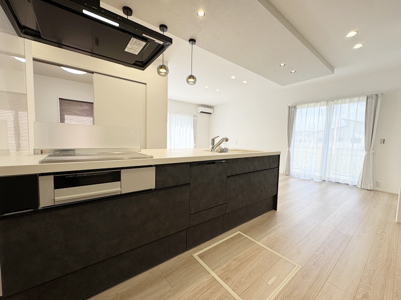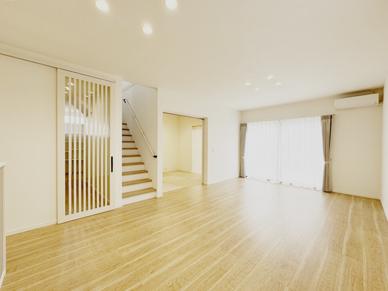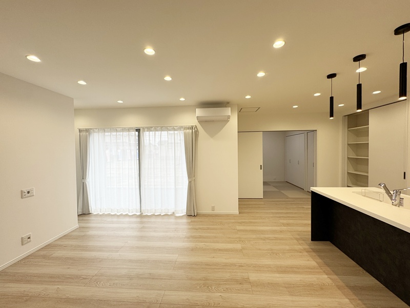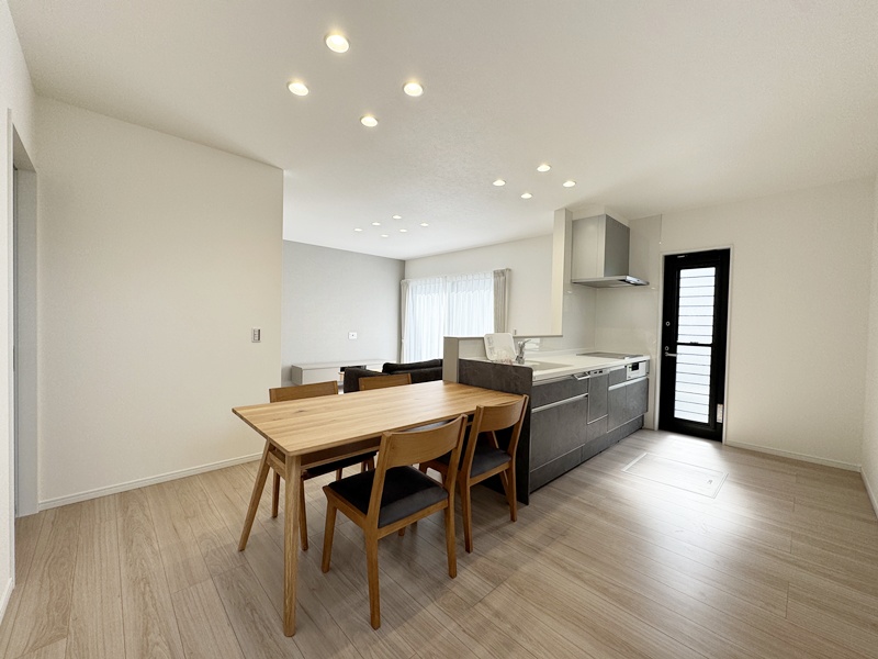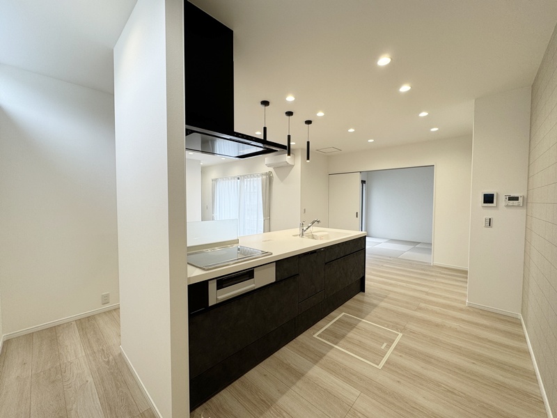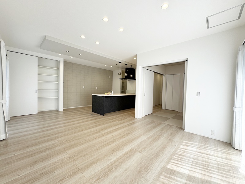 - 20帖の広々としたLDKは和室とつながっているので20帖以上の広さを感じることができます。キッチンは左右どちらからでも動くことができ、ダイニングと横並びにし家事がしやすくなっています。