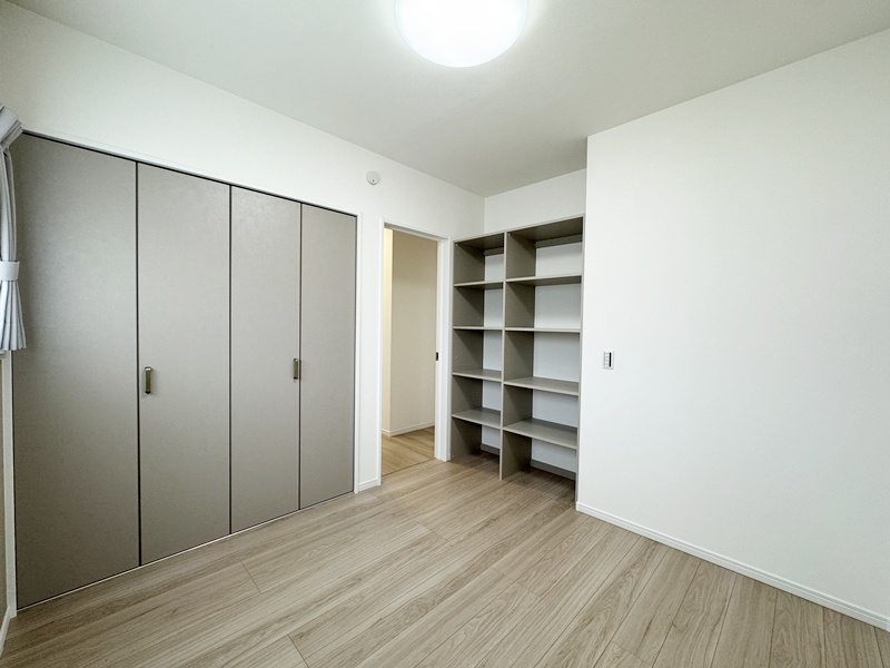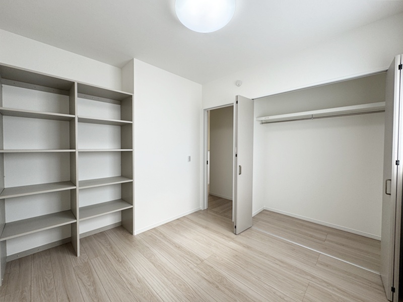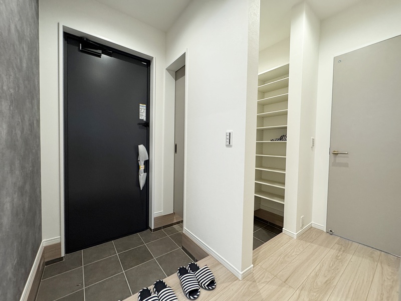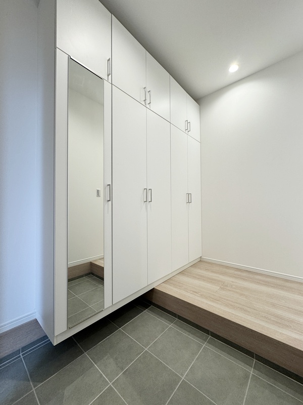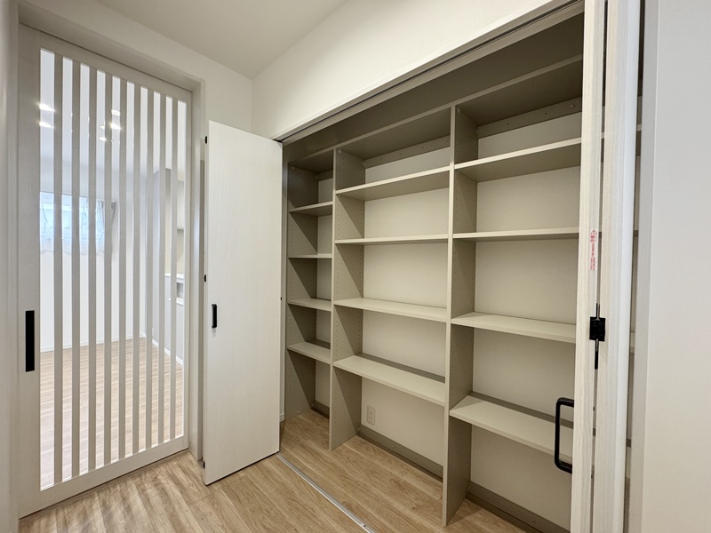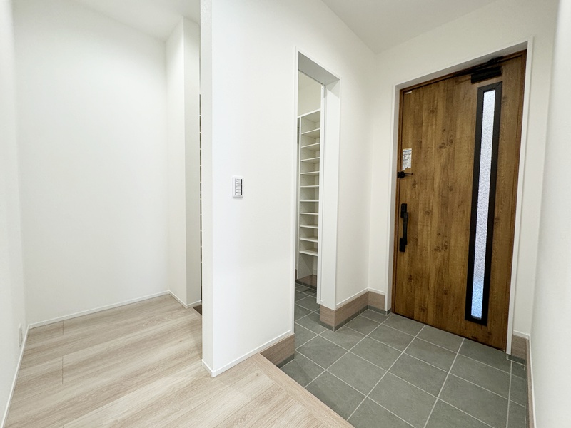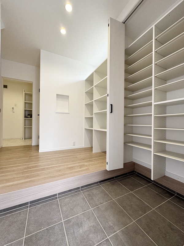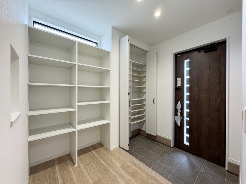 - 玄関ホールに収納を設けているので日用品のストックや掃除道具を収納でき取り出しも簡単です。棚付きの収納なので綺麗に収納することができます。