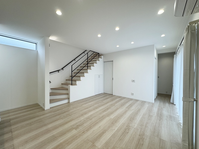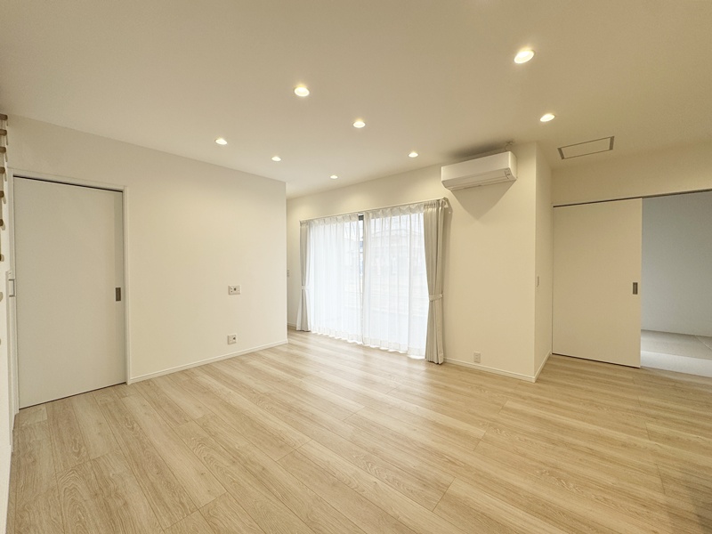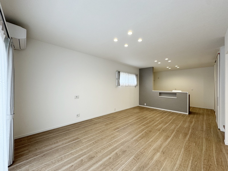 - ストレートタイプのLDK。南側に窓を設けているので日光をしっかりと取り込むことができ開放感を感じれる明るいLDKです。