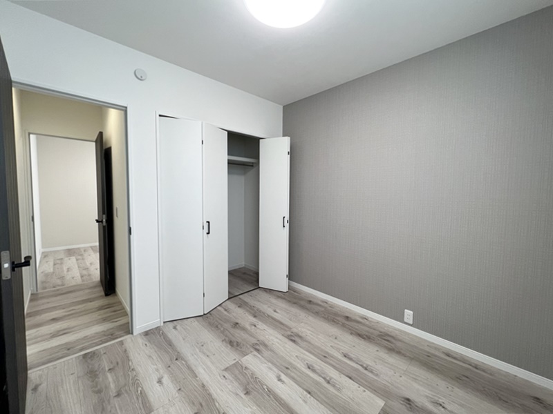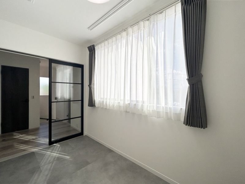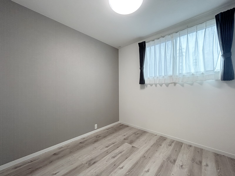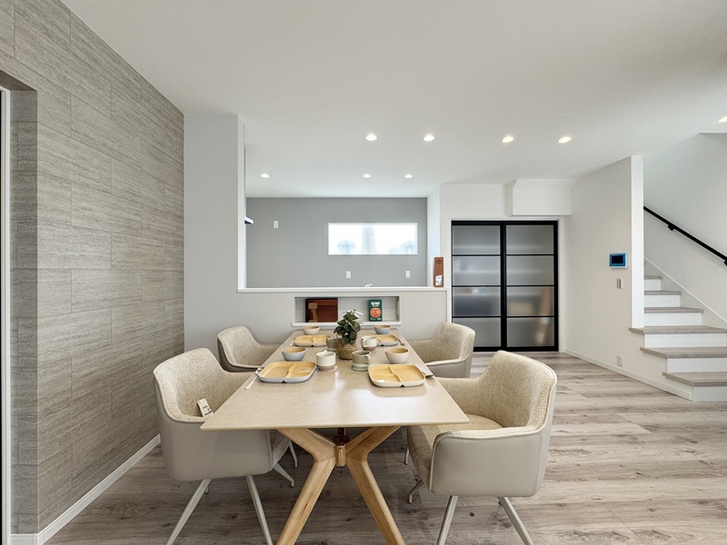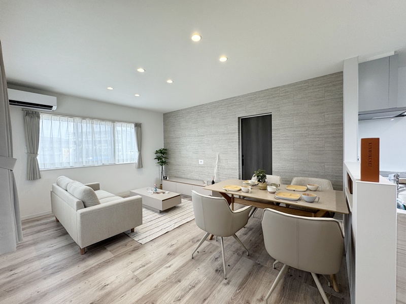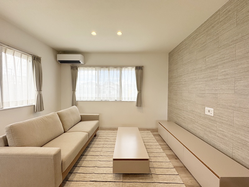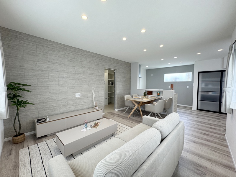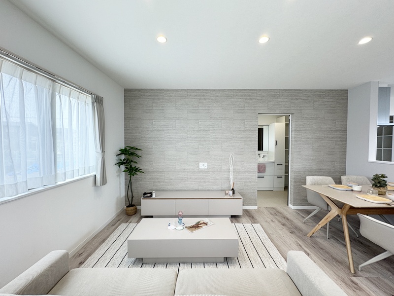 - グレーのアクセントクロスがホテルライクな空間を演出。3カ所から採光を取り入れリビングを明るく照らしてくれます。