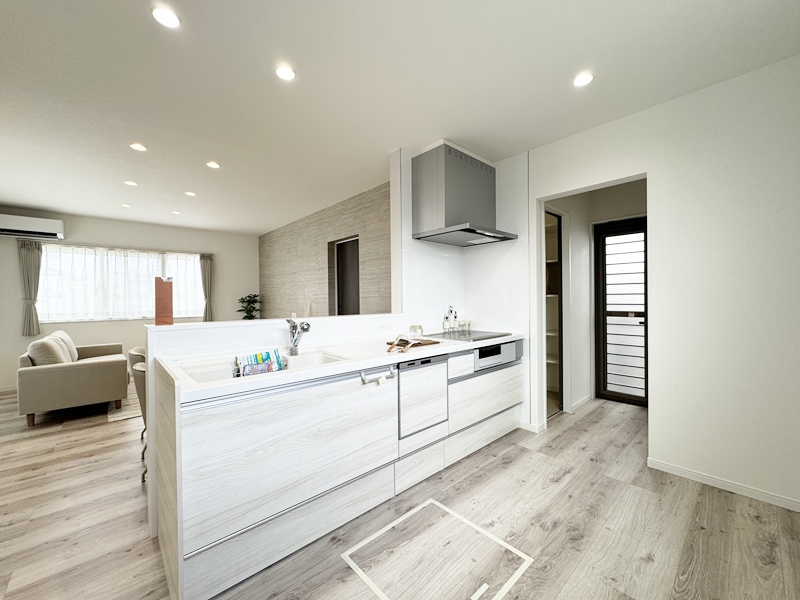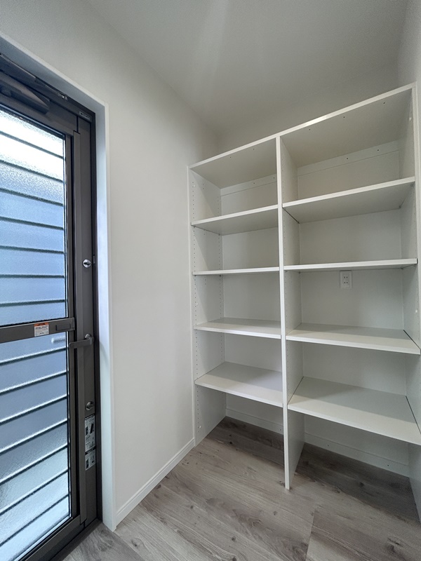 - キッチンと洗面室をつなぐパントリーは家事をスムーズに。洗面室とパントリーは可動棚付きで大小気にせず収納可能。