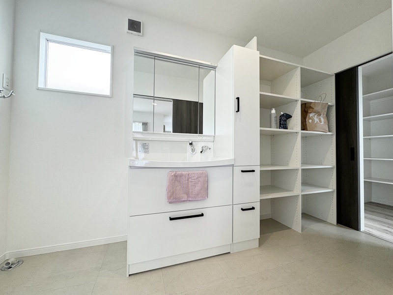 - 洗面室は可動棚が2カ所。用途にあわせて使い分け、大小気にせず収納できます。