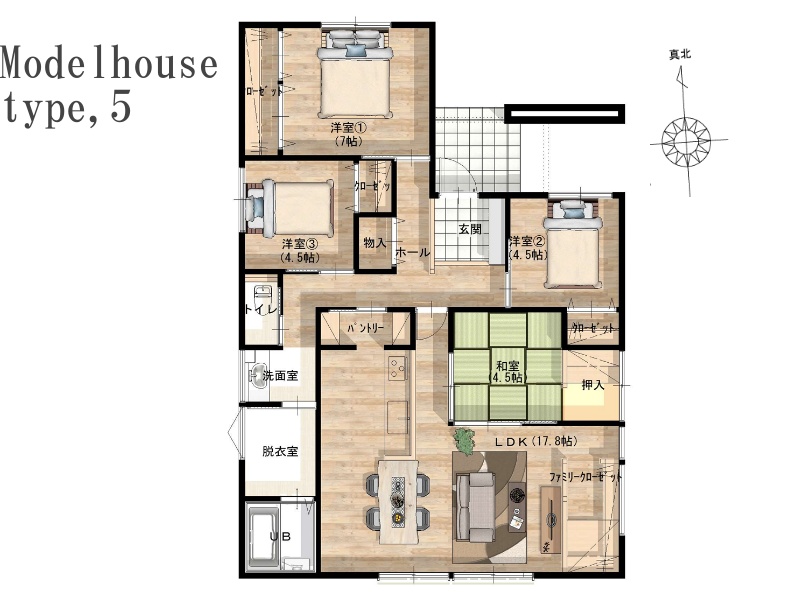 玄関から各居室へ無駄なくつながる設計で、プライベートも大切にできる間取です。パントリーやファミリークローゼットなど、収納にもこだわりました。