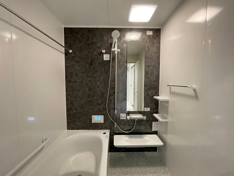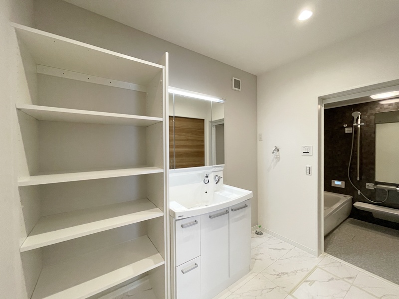 洗面脱衣室はゆったりとした広さで可動棚付き!浴室で室内干しした洗濯物をその場で畳んで収納もできます。入浴時間もゆっくりくつろげます。