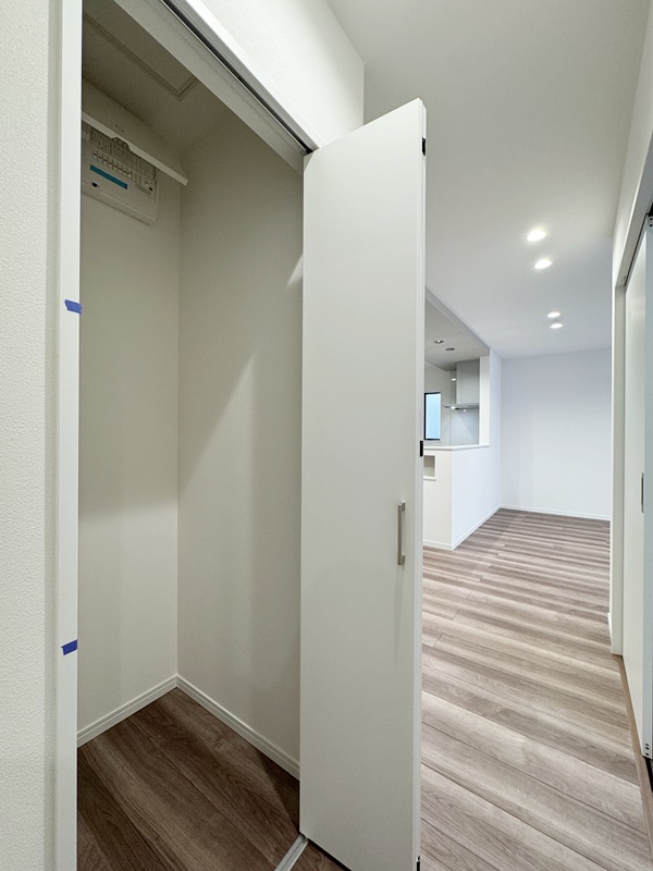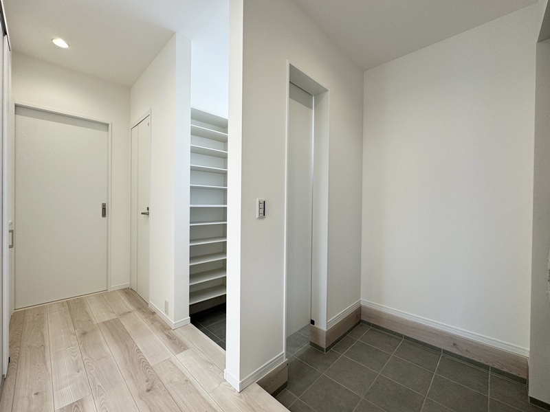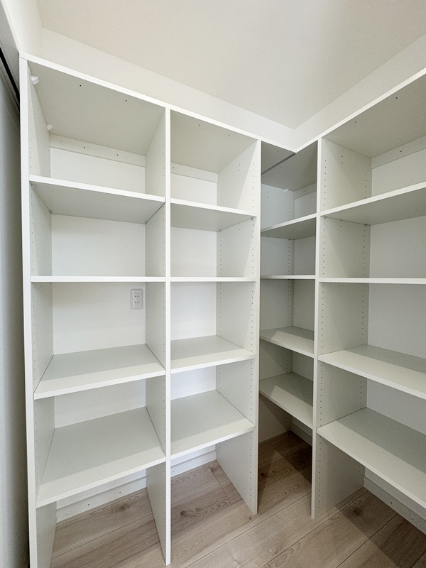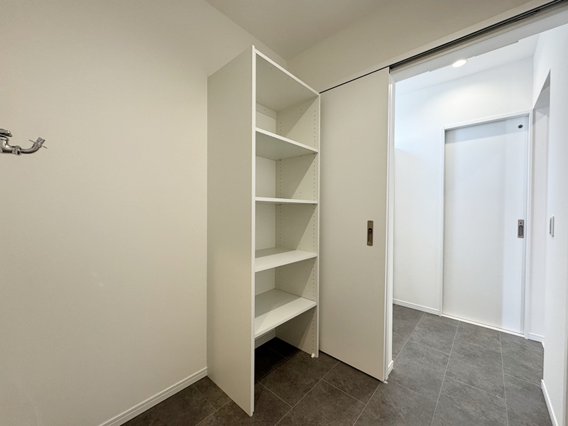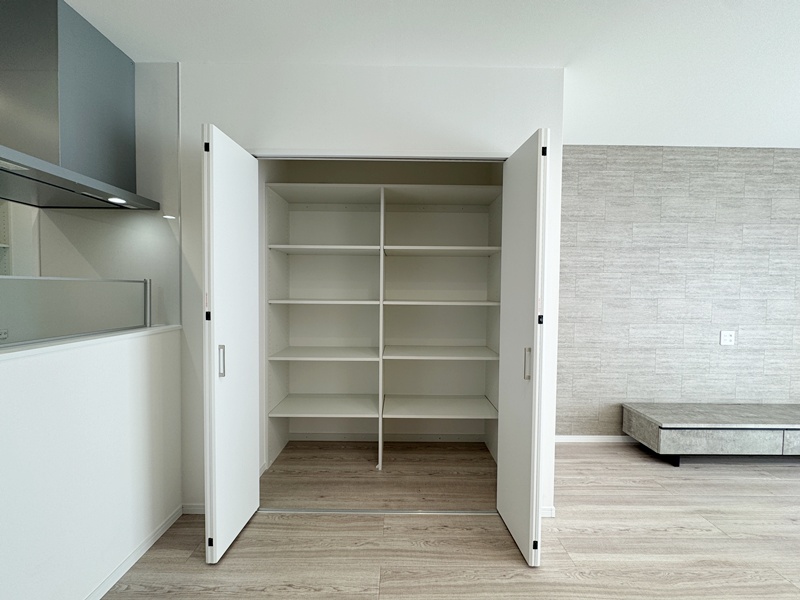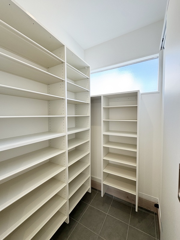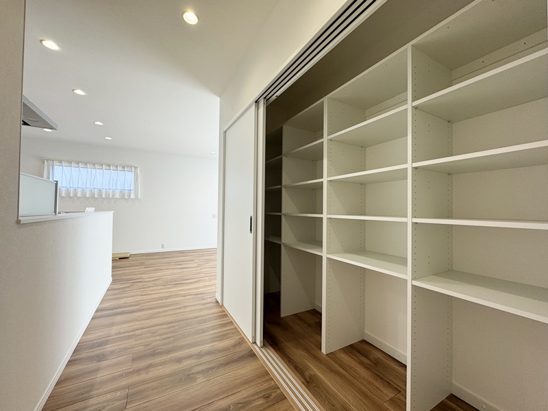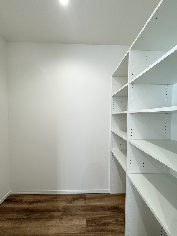 - キッチン横に設けたパントリーは、玄関ホールからも出入りできる便利な動線設計。買い物帰りに重たい荷物を持ったままでも、最短距離で収納でき、日々の家事負担を軽減してくれます。