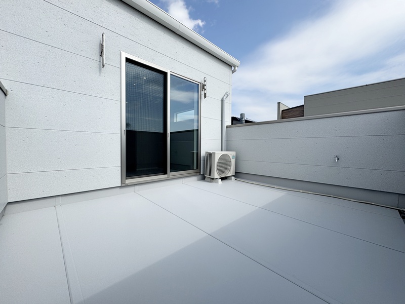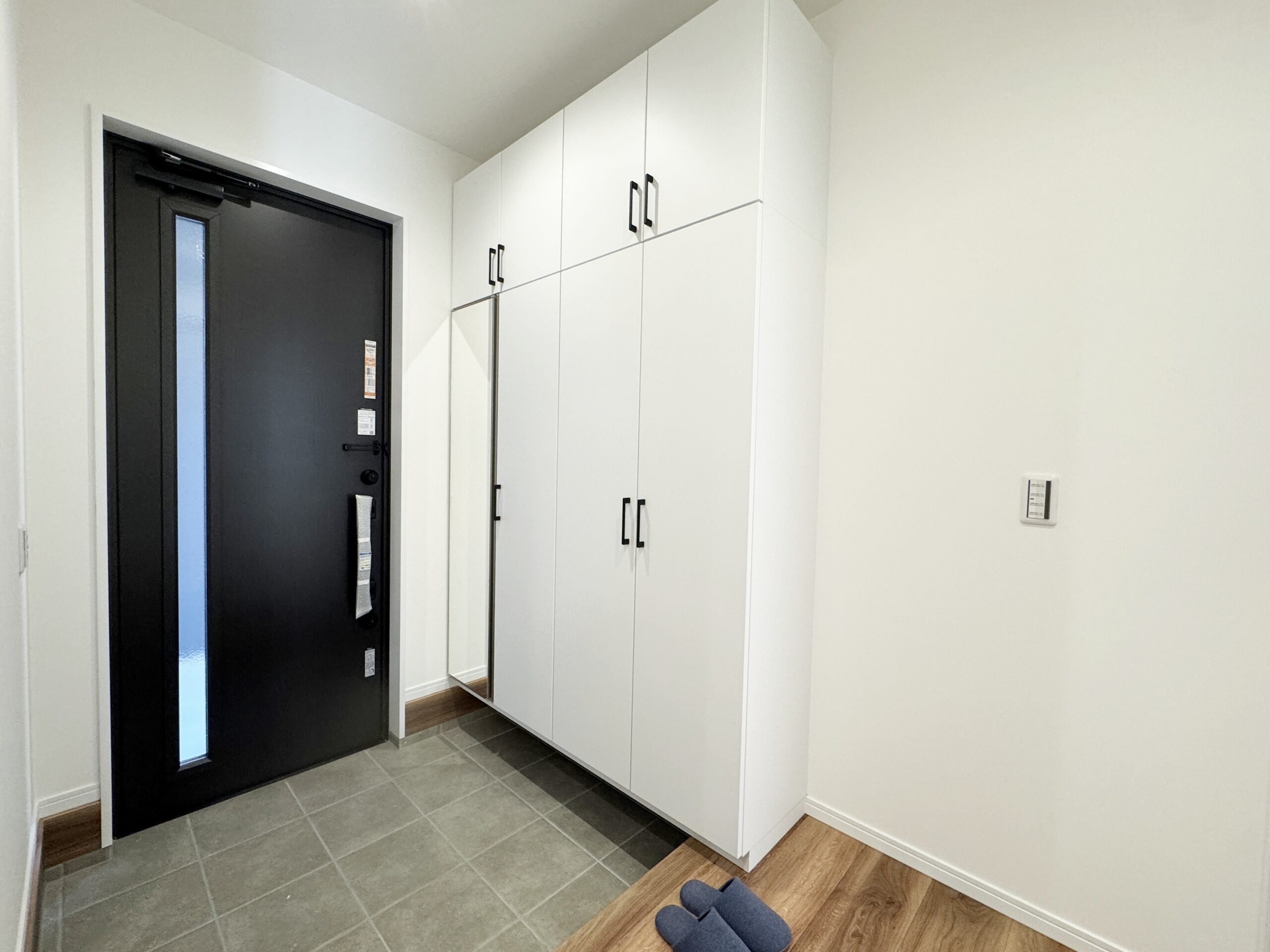 - 玄関外に外部収納を配置。ベビーカーや外遊びグッズ、レジャー用品などをそのまま収納でき、帰宅後の片付けもスムーズ。