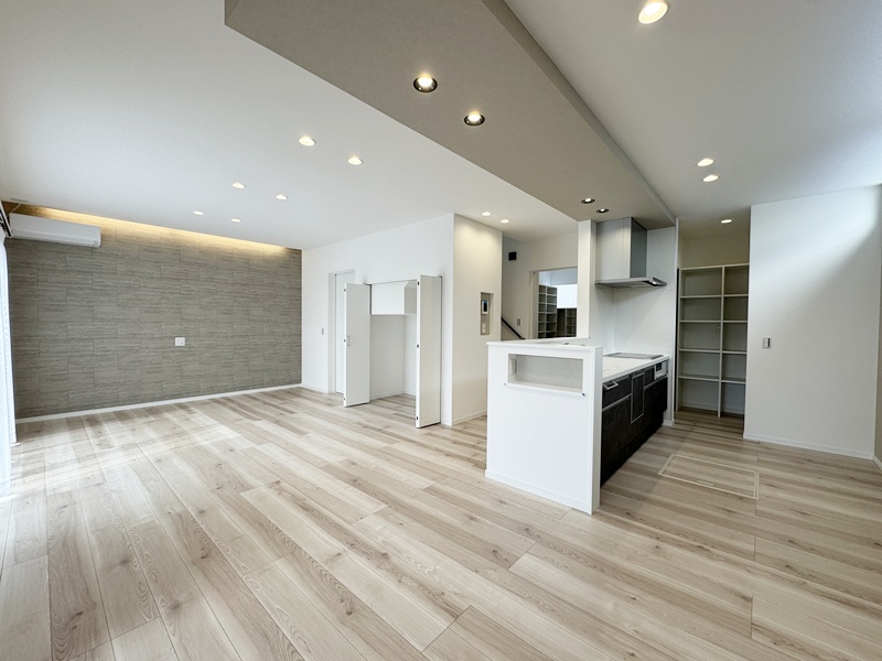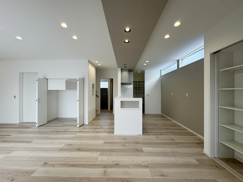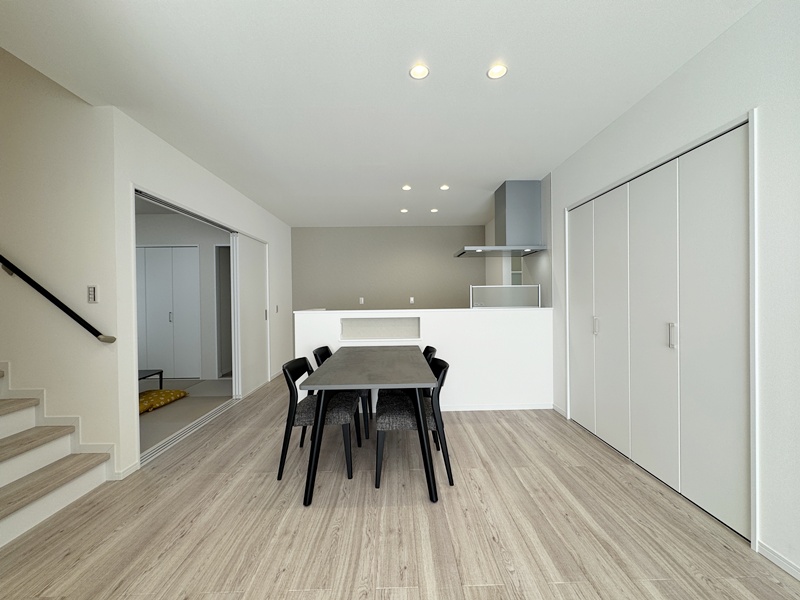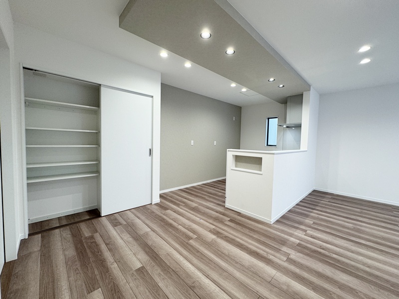 - ダイニング居城に稼働棚収納を配置。食品ストックや生活用品、学校用品などまとめて収納でき、必要なものをすぐに取り出せる、家事動線にも配慮した設計です。