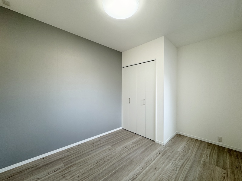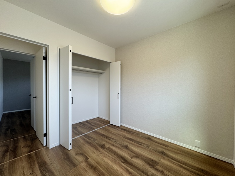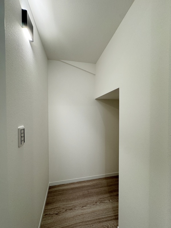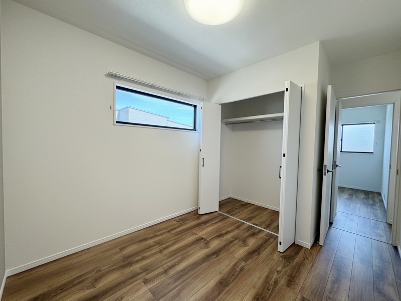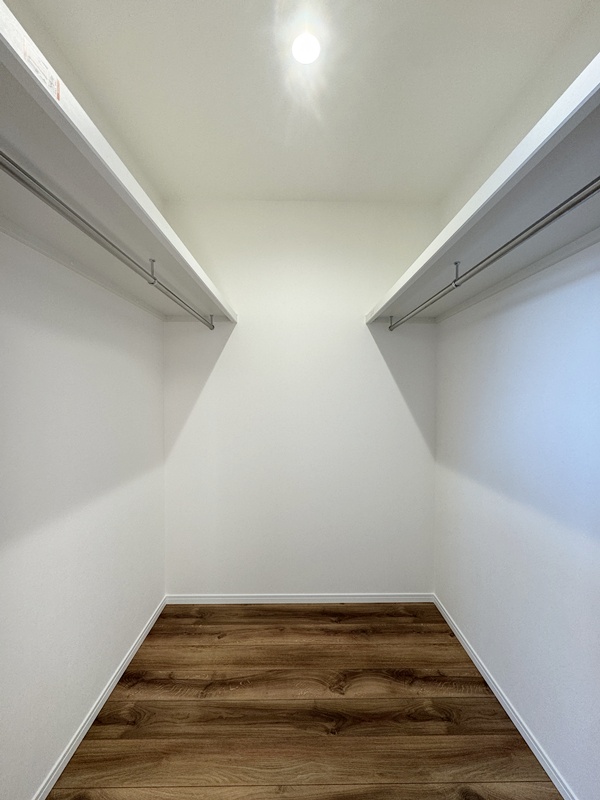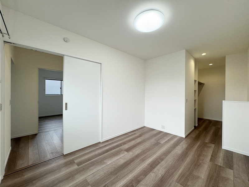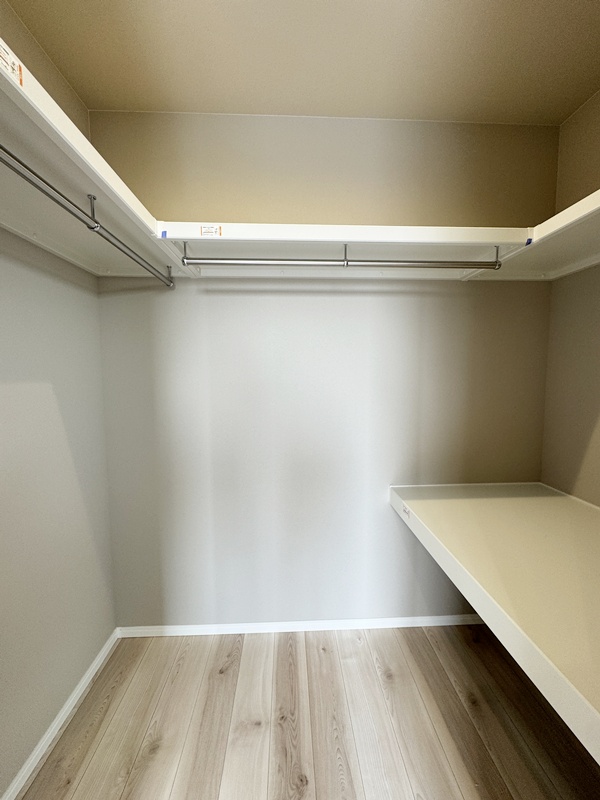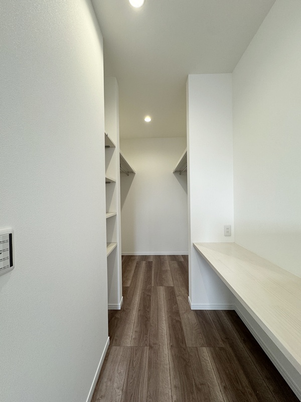 - 主寝室ひデスクカウンターとウォークインクローゼットを配置。ワークスペースや書斎として使えるデスクに加え、背面には収納棚を設け、書類や小物もすっきり整理。身支度から作業まで、主寝室で快適に完結できる設計です。