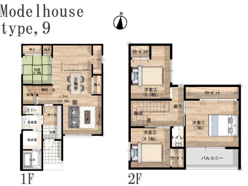 家族でゆっくり過ごすLDKは19.3帖あり、南向き。2階には3部屋あるので、それぞれの時間も気兼ねなく過ごせます。また随所に収納を設けた1階は、モノの移動を最小限に抑えられ、サッと片付けられて便利です!