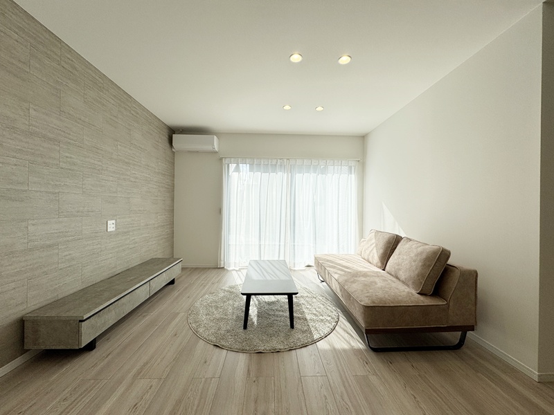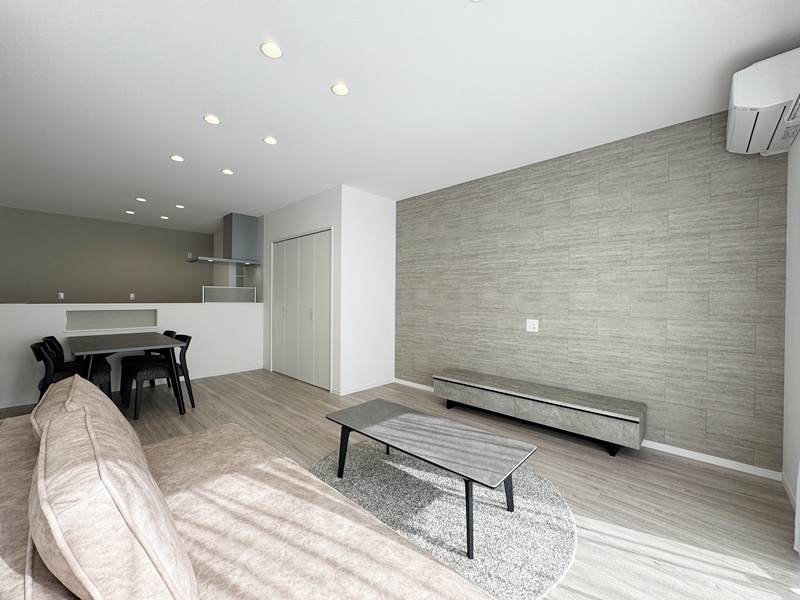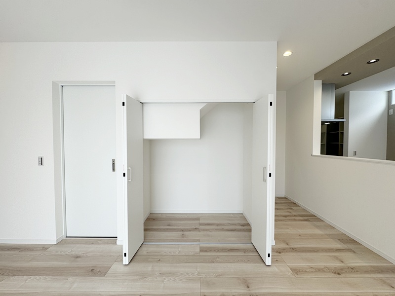 - リビング一角に横広い扉付き収納を設け、収納力とデザイン性を両立。日用品や書類、リビング小物をまとめてしまえるため、空間をすっきりと美しく保てます。