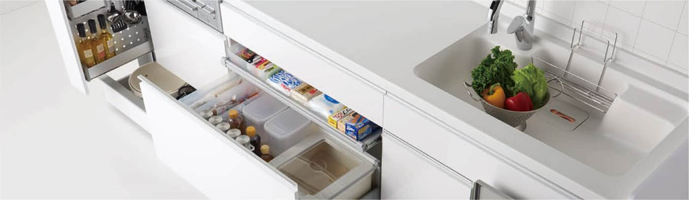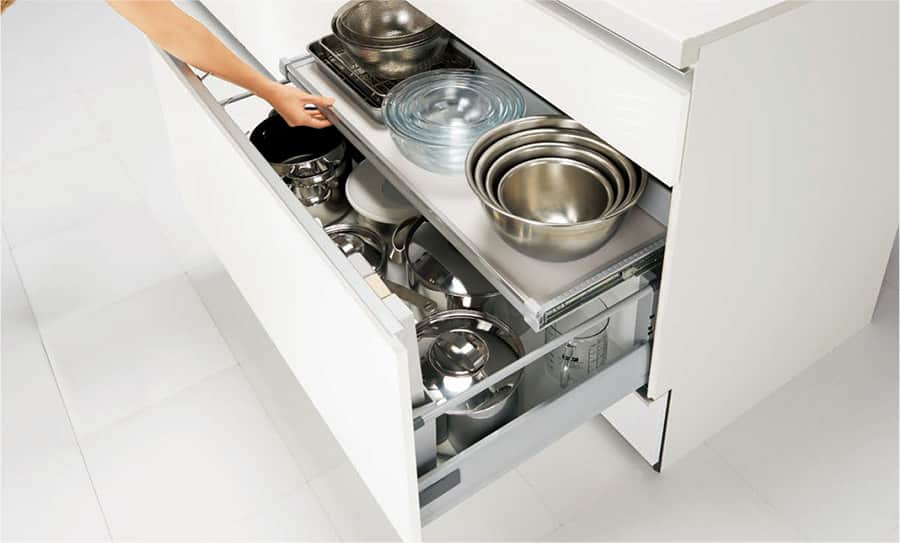 棚板のように簡単に取り付け位置をかえられるのに、引き出して使える、これまでにない便利な収納です。