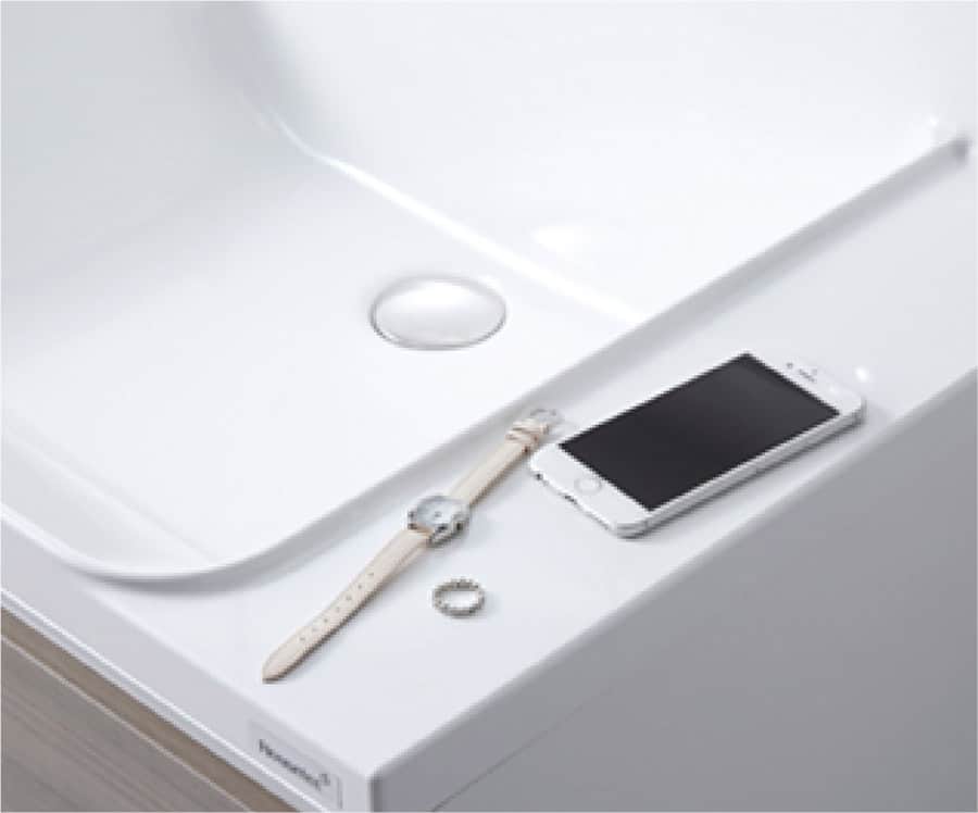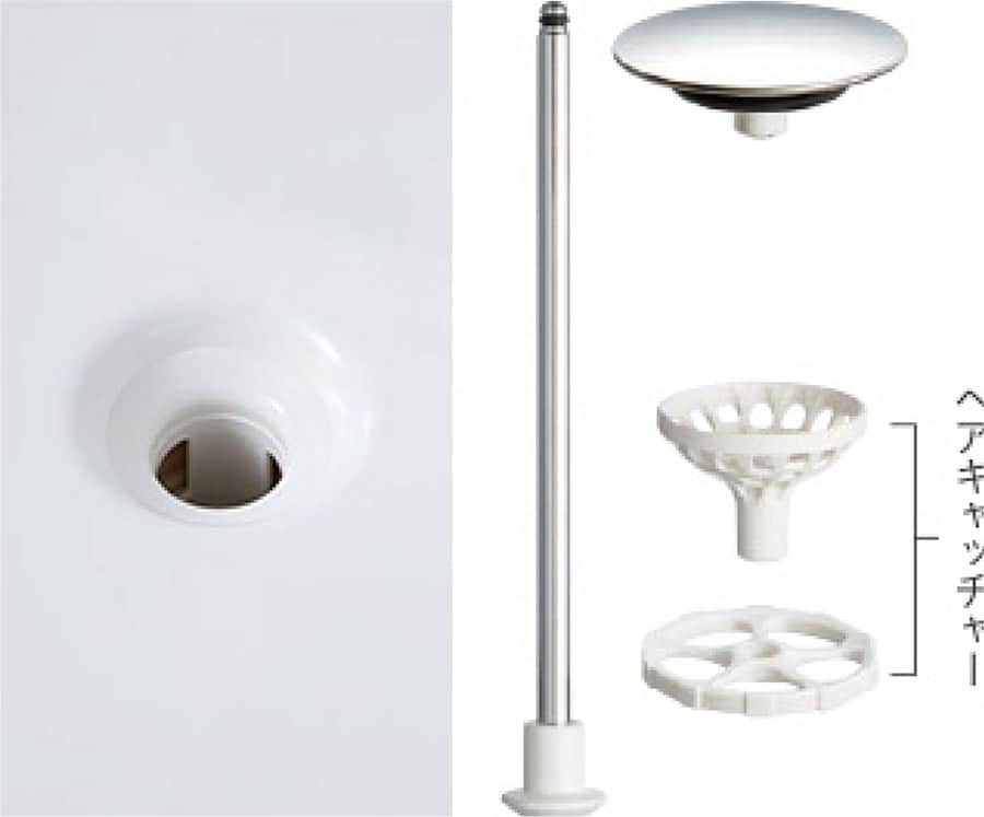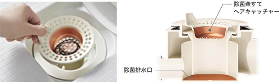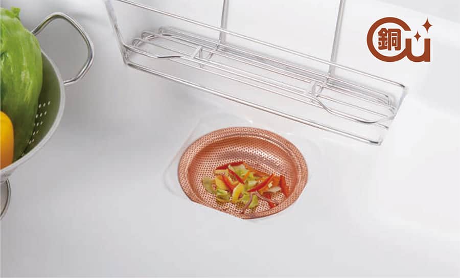 銅の優れた除菌特性を活かし、ヌメリやイヤな臭いが発生しやすい排水口内に銅プレートを設置しました。また、排水の勢いだけで流れた髪をまとめられ、ゴミ捨てがラクラク!
