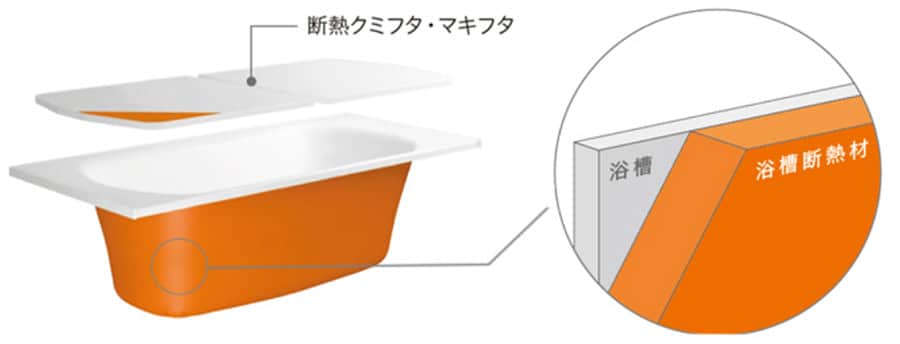断熱材で浴槽を囲むことで、一般の浴槽と比べて保温力がアップ!4時間経っても湯温低下はわずか2.5℃以内に抑えられ、追い焚きも少なくてすみます。家計や環境にも優しい浴槽です。
