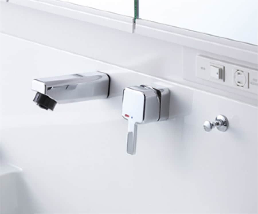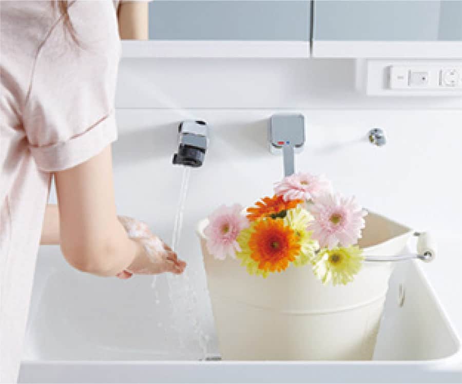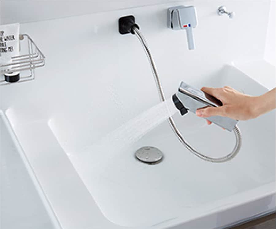 整水・シャワーの切り替えがワンタッチで行え、水栓ヘッド部は引き出して使用可能。左右に15度ずつ首振り機能がついているので、ボウル内によけたいものがある時に便利です。