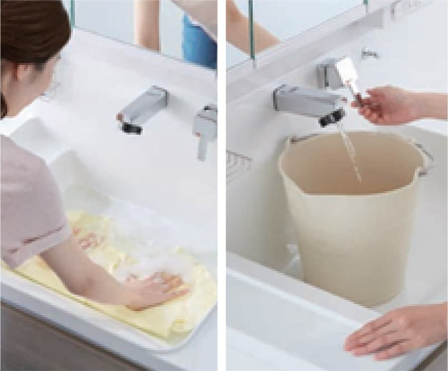床表⾯に特殊処理が施されており、親⽔効果で汚れと床の間に⽔が⼊り込み汚れ落ちがスムーズです。ブラシでのお掃除がラクラクです。