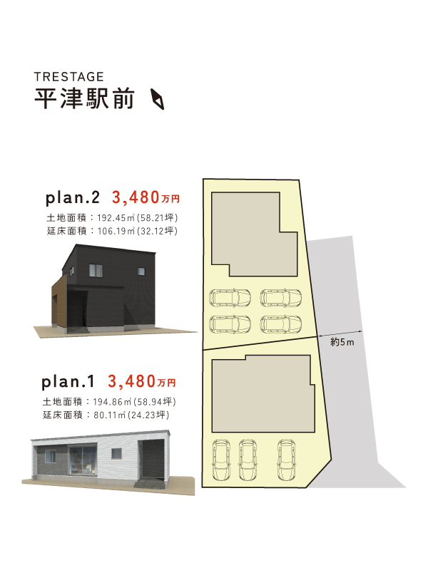 ■トレステージ平津駅前概要 ●所在地/三重県四日市市平津町字西川原1076-6他●交通/三岐鉄道三岐線「平津」駅・・・約270m(徒歩約4分)●地目/宅地 ●用途地域/第1種住居地域●建ぺい率/60%●容積率/200%●道路幅員/東側道路公道幅員(約5.0m)南側道路公道幅員 (約5.0m) ●下水/公共下水●雨水/側溝排水 ●電気・上水道/中部電力(オール電化)、公営水道 ●総区画数/2区画 ●販売戸数/一戸建:1戸 ●土地面積/192.45㎡~194.86㎡●建物面積/80.11㎡ ●販売価格/3,480万円 ●入居時期/相談 ●取引態様/売主