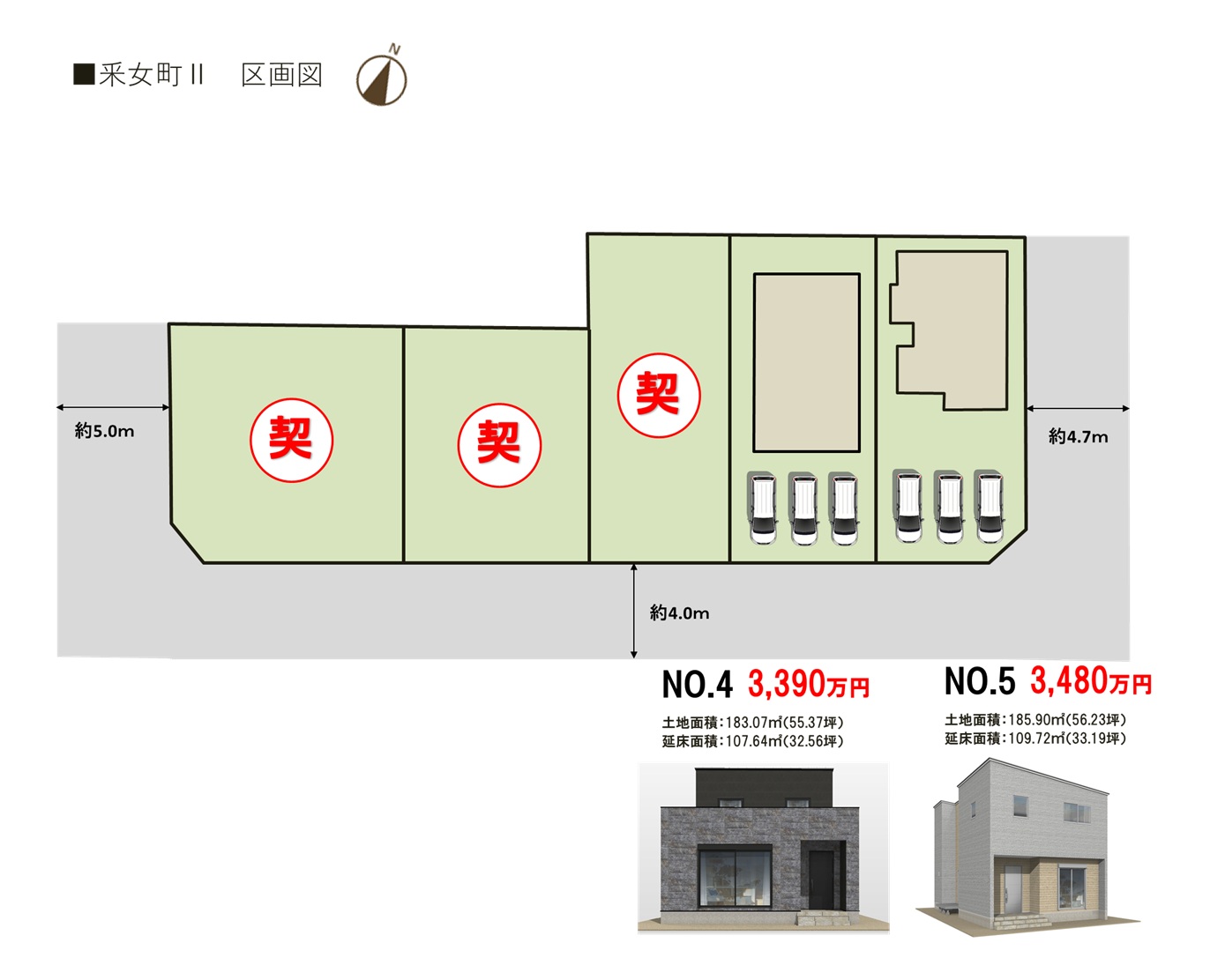 ■トレステージ采女町Ⅱ概要 ●所在地/三重県四日市市采女町110-7 ●交通/四日市あすなろう鉄道内部線「内部」駅徒歩約5分(約400m)●地目/宅地 ●用途地域/第2種中高層住居専用地域●建ぺい率/60%●容積率/160% ●道路幅員/南側公道幅員(約4.0m)、東側幅員(約4.7m) ●公共下水 ●雨水/側溝排水 ●電気・上水道/中部電力(オール電化)、公営水道 ●総区画数/4区画 ●販売戸数/一戸建:2戸 ●土地面積/183.07㎡~185.90㎡ ●建物面積/107.64㎡・109.72㎡ ●販売価格/3,390万円~3,480万円●入居時期/相談 ●取引態様/売主